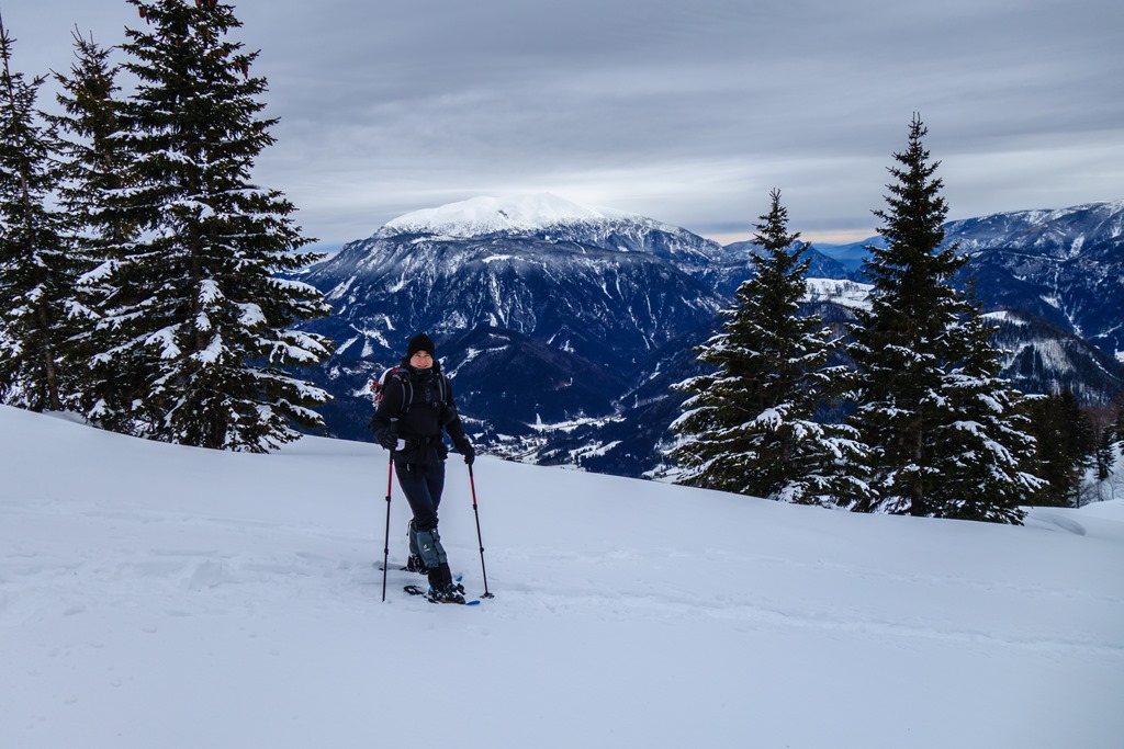 Schwarzau im Gebirge temploma tornyában lakó óra éppen háromnegyed kilencet kongat, amikor elmasírozunk mellette. Egyelőre hónak nyoma sincs, de alig érünk be az erdőbe, a Hauskogel alatt, máris gondunk akad, az olvadások és fagyok egymásutánjában edződött jégpáncéllal. Előkerülnek a magunkkal hozott vaskarmaink, minek következtében gond nélkül vesszük a kacifántosan meredek bevezető kaptatót, ami egy széles erdészeti úthoz visz fel (lenti kép).