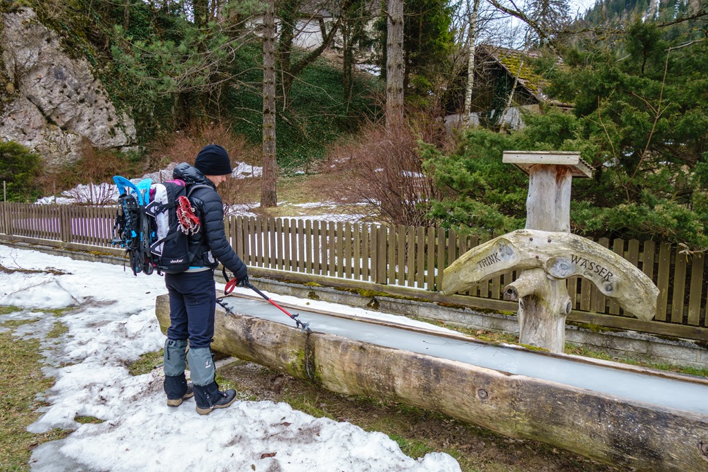 1100 méter alá érve ismét a kőkemény jégbevonatba botlunk és azonmód hótalpakról könnyű hágóvasra váltunk. Le sem vesszük a vasat a bakancsainkról, míg a Hirschbach patak menti Feldhaas/Seeböck településeket el nem érjük. A továbbiakban már csak aszfaltúton gyalogolunk vissza a reggeli kiindulópontba.