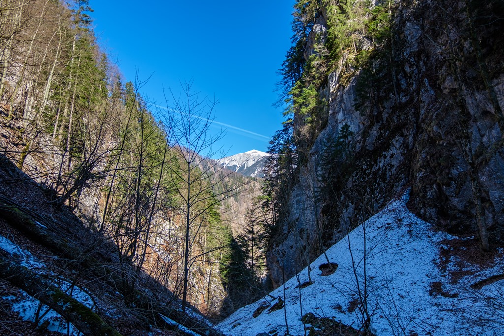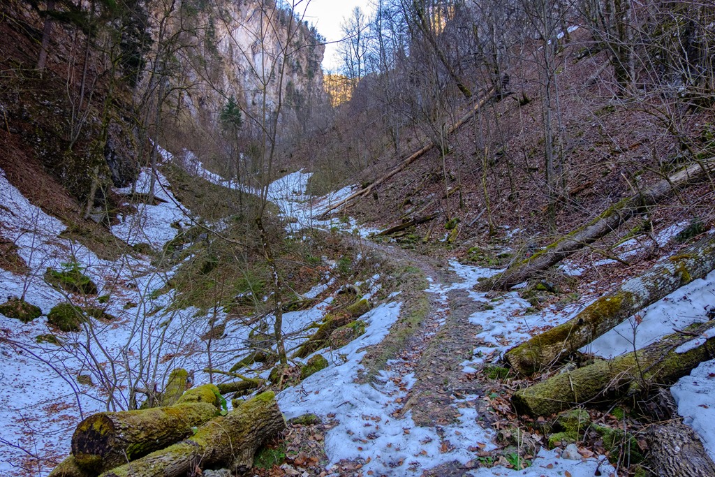 Elhagyom a napos részeket, majd 13:30-kor haladok át a sziklahasadékon (fenti kép), mely a Kesselgraben vadabb mezsgyéibe vezet. Közben a reggel még árnyékos részeket bevilágítja a pályáján délutáni ereszkedésbe kezdett nap. Így már nem hatnak olyan fenygetően a környezet kulisszái. A másfélórás út eseménytelenül telik el. A sziklával felszórt részeket megpróbálom tudatosan is a lehető leggyorsabban magam mögött hagyni és még véletlenül sem elidőzni a veszélyes falak tövében. 14:50-kor vagyok ismét az árok szájában. Egy remek kalanddal gazdagodott a repertoárom. A kőomlás veszélyét szem előtt kell tartani, különösen így tavasszal, amikor a sziklák lazább részeit még összetartó fagy elcsitul.