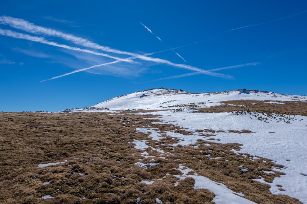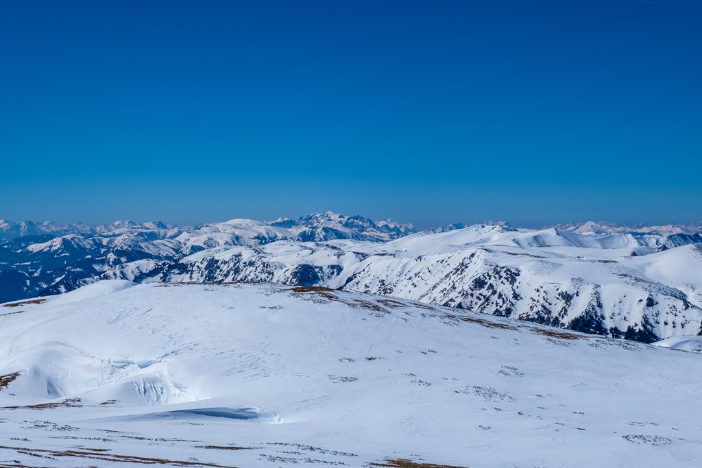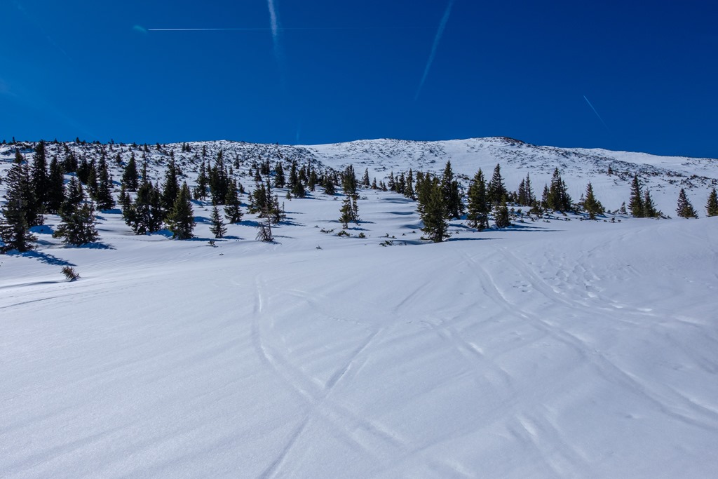 Még nincs 11:00 óra, amikor érkezem a felismerhetetlenségig behavazott Klobentörlbe. A sárga jelzőtáblát hiába is keresném valahol a hórétegek alatt lapulhat. A nyári kirándulásaimból ismert másfél-kétméteres törpefenyők téli álmukat alusszák a vastag hó alatt. Nem kell kerülgetni tehát bokrokat, nem kell ösvények után kutatni, hanem egyszerűen csak toronyiránt, illetve hát a GPS útmutatása és a felelhető nyomok szerint haladni. Jó tempóban 11:45-re elérem célom a Scheibwaldhöhe 1943 méteres lapos, száraz füvel borított csúcsát (lenti kép). Négy órával számoltam, a 3:45 órás sportos menetidő, beleértve 1400 méteres szintemelkedést (combgörcs legkisebb jele nélkül), megelégedéssel tölt el.