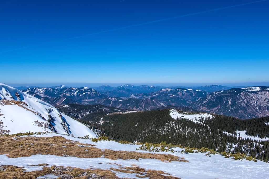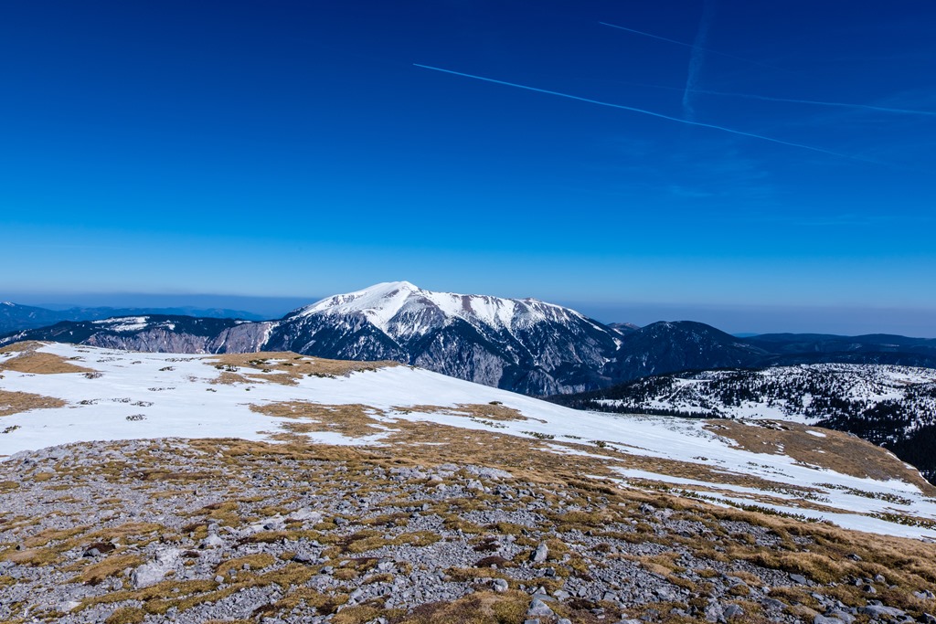 A csúcson legelőszöri is átöltözöm, teljesen átizzadt trikómat szárazra cserélem. Olyan erőteljesen süt a nap, hogy még meztelen felsőtesttel is kellemesnek érzem az időt. Imitt-amott lebbenő jeges fuvallatok azonban mégiscsak öltözésre ösztönöznek. A továbbiakban jön a túra legkellemesebb, a laza, nyugodt, a behavazott világra (és a Schneebergre – fenti képek) őszinte örömmel rácsodálkozó része.