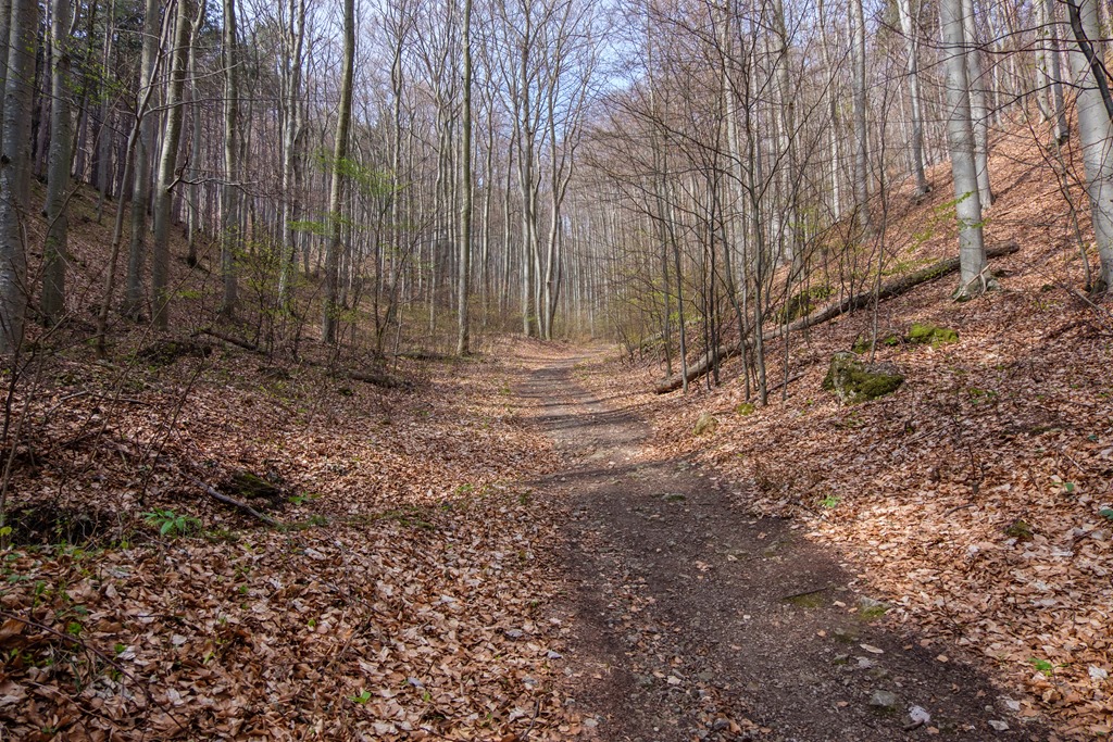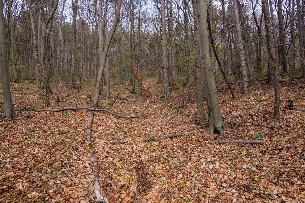 Találok is egyet (9:27 – fenti kép). Valamikor az erdészeti fakitermelést szolgálhatta. Most mélyen fedi az avar, süppedek, de a vonalvezetés jól látható. Feljebb aztán eltűnik a semmiben, de így koratavasszal a gyér aljnövényzetnek köszönhetően könnyen megtalálom a lapos hegy legmagasabb pontját. Van egy megtévesztő elő-csúcs is, kőhalom jelzi, de a tulajdonképpeni Badner Lindkogel 582 méteres kiemelkedése egy picivel még odébb van (9:50 – lenti kép).