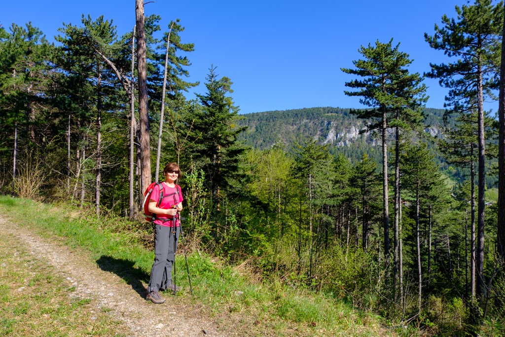 Ebédszünet után eredeti tervünknek megfelelően átvágunk a Flatzar Wand legtetején. Az ösvény helyenként szűk, sziklás és kitett, nem árt a fokozott figyelem. Jobbkéz felől folyamatosan jönnek a vadabb kalandokat rejtegető, mélybe bukó ösvények beszállói. Mi maradunk a fal tetején futó turistaúton, ami később egy széles erdészeti útba torkollik. Egy hajtűkanyar után le-fel hullámzó úton érkezünk vissza Waldbauerhoz.