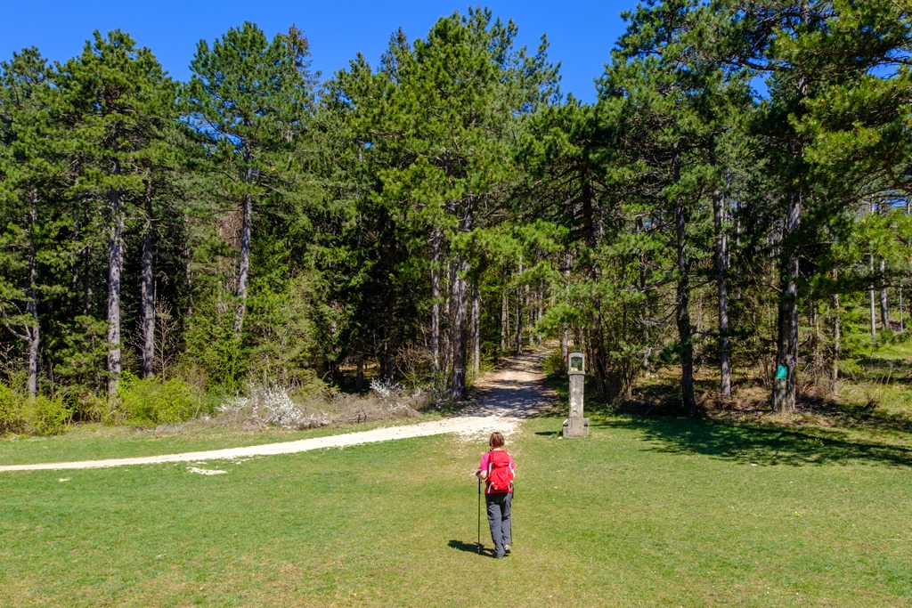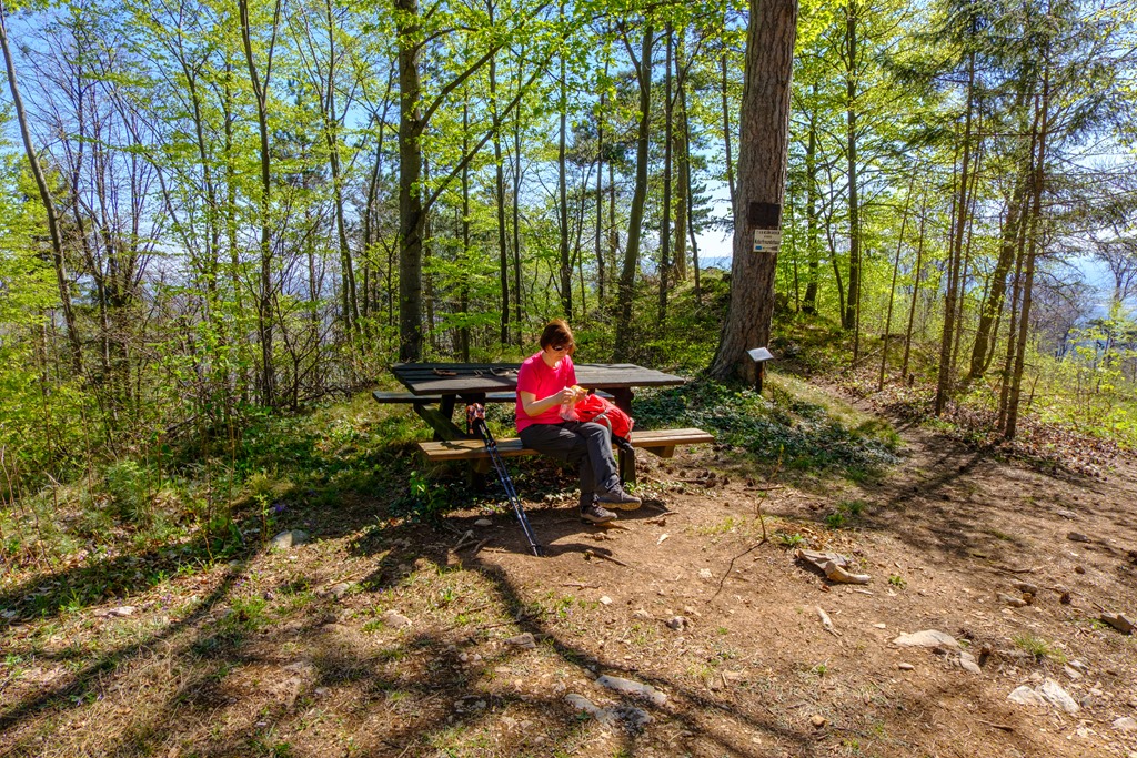 Waldbauert megkerülve, széles erdészeti úton sétálunk, majd enyhe emelkedőn érkezünk az alig 700 méter magas Schönbühelre (lenti kép). Közben egy padon pihengetünk egy sort, hogy újult erővel folytathassuk sétánkat ezen a minden ízében remek napon.