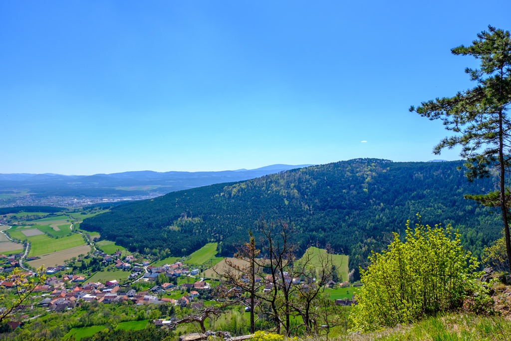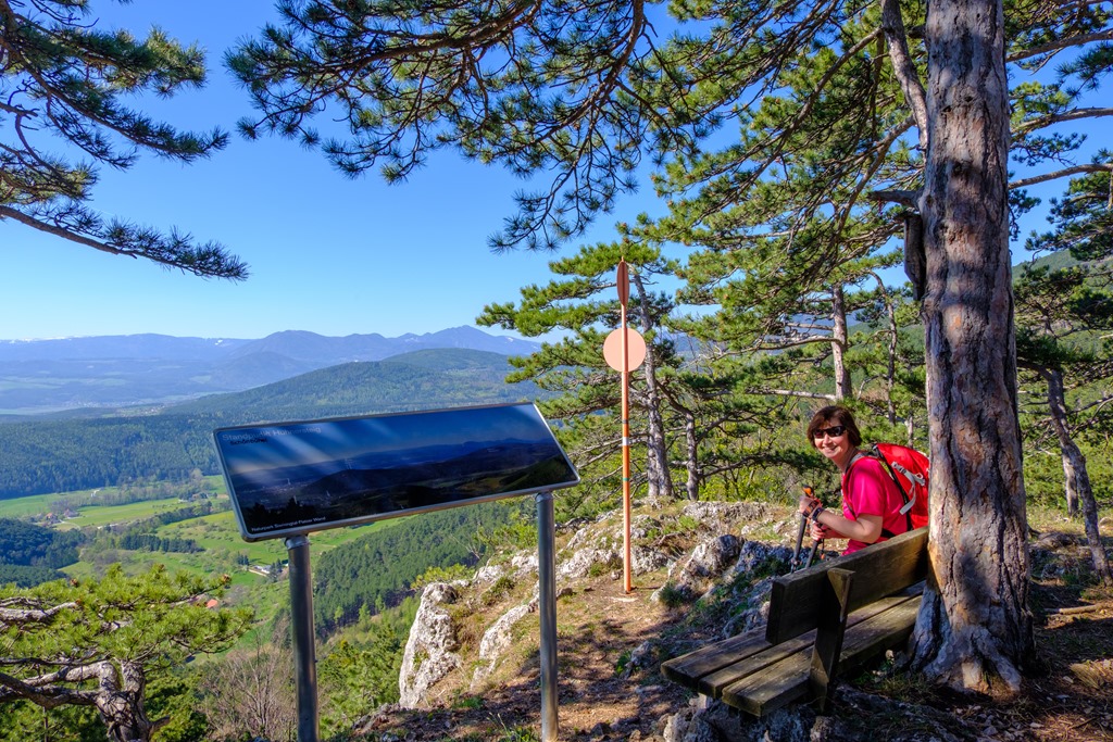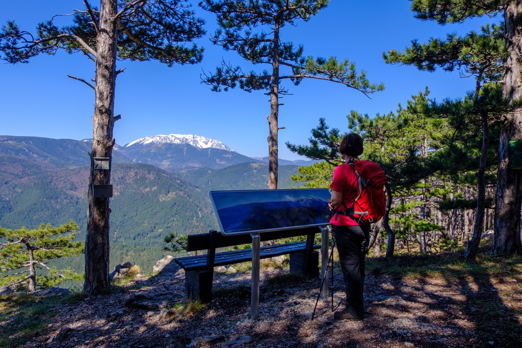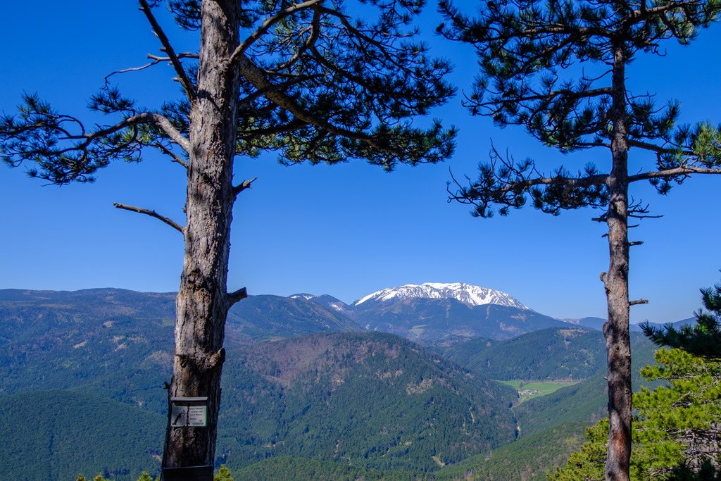 A Schönbühel alatt egy kilátó hívogat rácsodálkozni a távoli Wechselgebietre, a Fischbacher Alpenra illetve a jellegzetes Sonnwendsteinre. Kicsit lejt az út, majd ismét laza kaptató következik aznapui túránk legmagasabb pontjára a domb szerű Gösingre (898m), melyet egy szép vaskereszt is jelez (lenti kép).