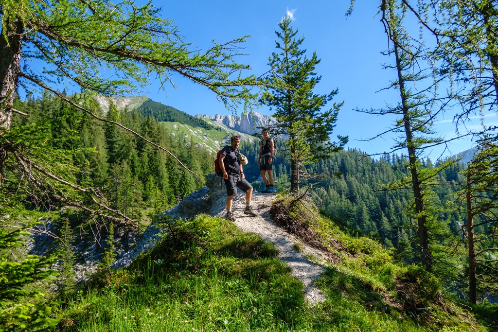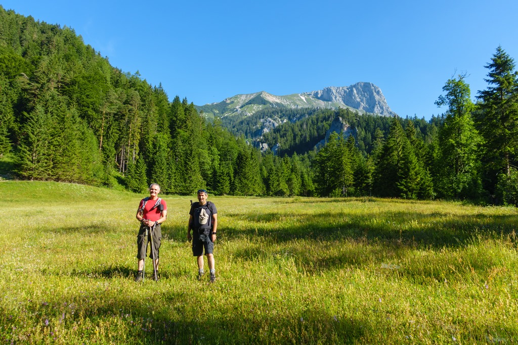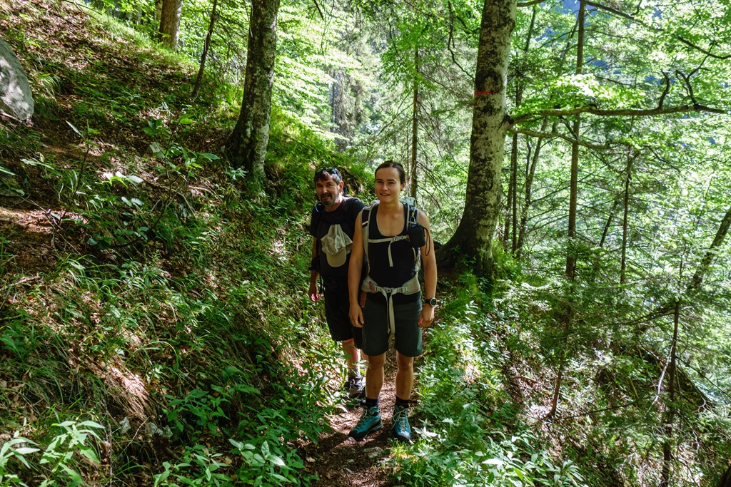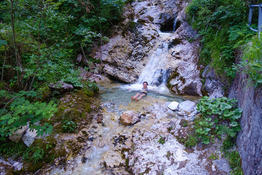 A Fölzalmon, bár betérésre hívogat a nyáron nyitva tartó gazda, mi ellenálunk és megállás nélkül folytatjuk utunk egy kellemetlen, morzsalékos helyenként ugyancsak jó meredek ereszkedőn (fenti kép, a háttérben a Fölzstein). 17:45-kor kilépünk a Fözklamm sziklakapuján, minek utána egy fürdőzés és felüdülés következik a Mitterbach jéghideg vizében.