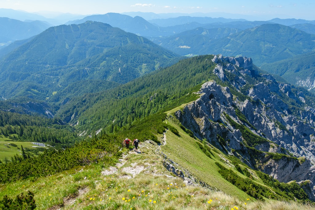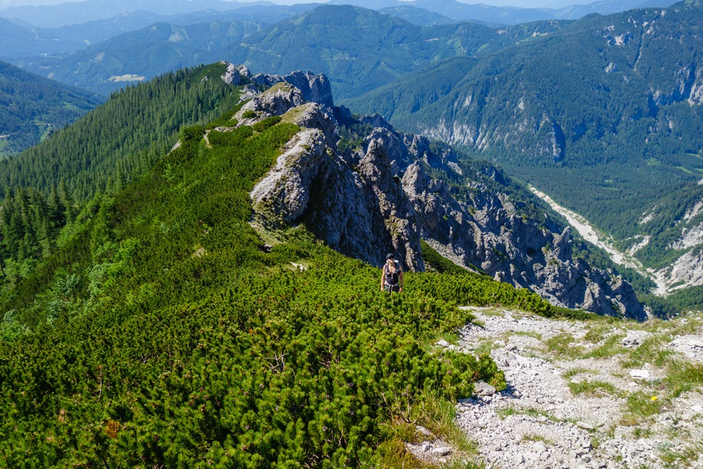 Ezután hamarosan érkezünk a hegy gerincére, a Zirbeneckre, (10:10) mely enyhén kitett, de annál pompázatosabb kilátásokkal remekelő emelkedőn visz felfelé (fenti képsorozat). Első köztes csúcsunk a Waschenrigel (1860m; 11:10;lenti kép – egy kőhalom jelzi).