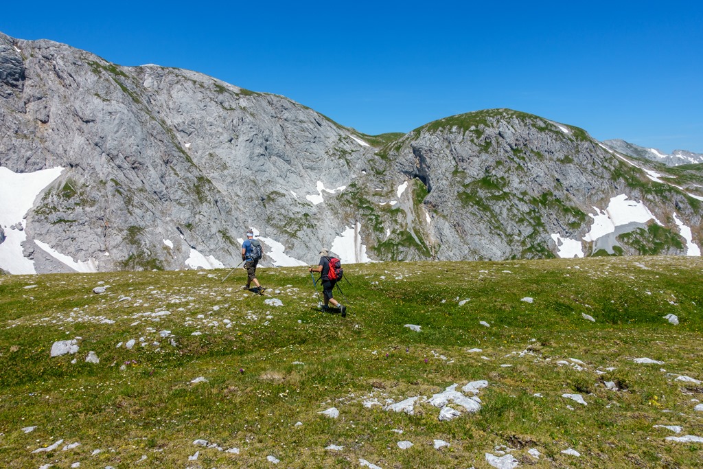 Negyedik és egyben utolsó csúcs-célunk, a Karlhochkogel felé viszont már nem hagyatkozhatunk jól látható csapásokra, mert az ilyenek ugyancsak fogyatkozóban vannak. Mintha az általános érdeklődés nyomait kitörölte volna a természet. Némi tájékozódási készség tehát elkel. Egy GPS nyomvonala vagy iránytű is jó segítséget nyújthat. Később, miután balról jobbra megkerültünk egy névtelen, de célunkat takaró hegyormot, előbukkan a Karlhochkogel elnyújtott gerince (lenti képek). Ez nagyban megkönnyíti a tájékozódást, már amennyiben a cél egyértelműen be van azonosítva.