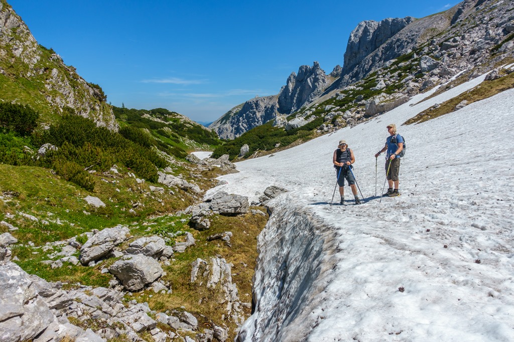 A télen itt leereszkedett lavinák táplálta hómezők még hosszú szakaszokon töltik ki a Dullwitzot. Keresztezésük a továbbiakban semmiféle gonddal nem jár, mert az árok alján haladunk, gyengén lejtő terepen (lenti képek).