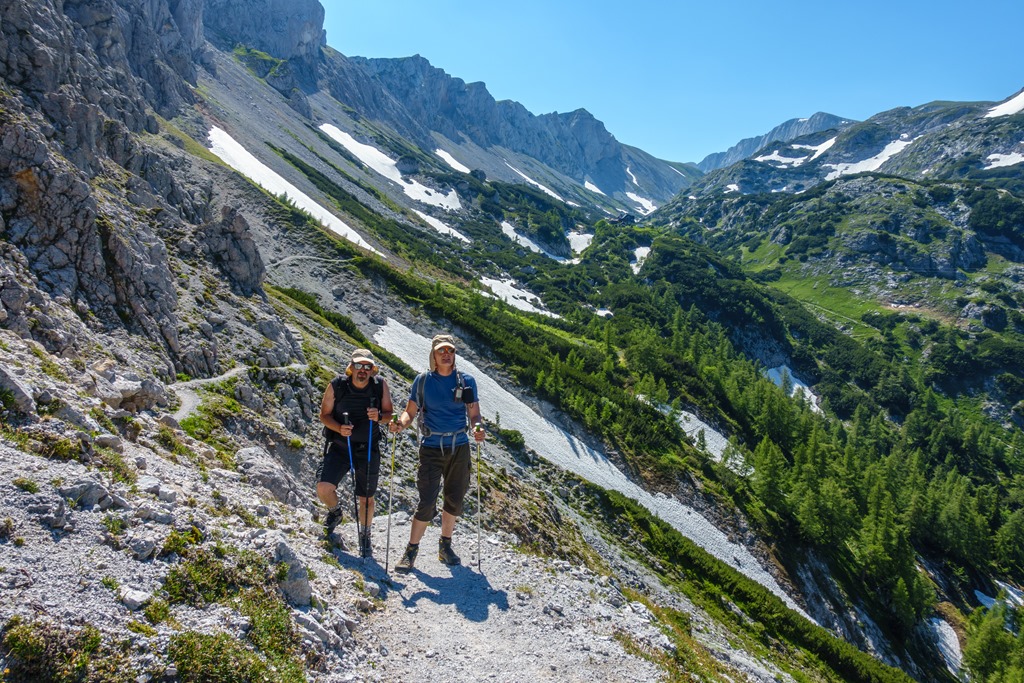 14:30-kor érkezünk a Voisthalerhüttebe, azaz, indulástól számítva 6:30 óra elteltével. Mivel a felhőtlen kék égről ragyogó napsugarakban eleddig sem szenvedtünk hiányt, inkább a kunyhó belsőjében foglalunk helyet, hogy elköltsük déli elemózsiánkat. Egy egész órányi időt szánunk a jól megszolgált pihenésre, miközben az elektrolitok pótlásáról sem feledkezünk meg.