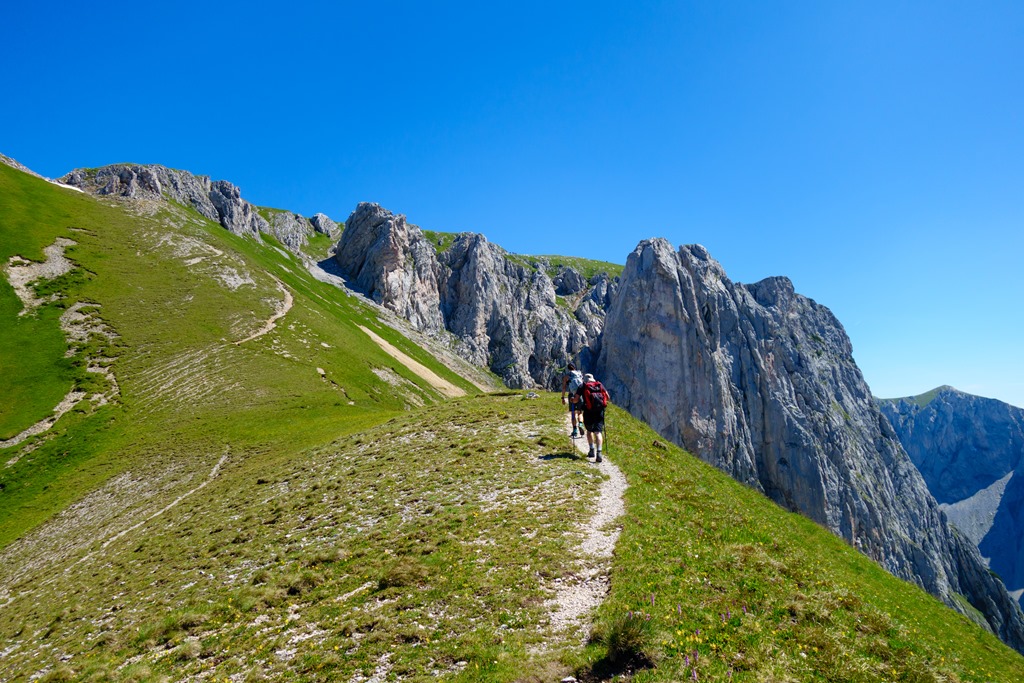 További gyengéd emelkedőn (fenti kép) érkezünk a Fölzstein füves platójára (lenti képek). A jó magas csúcskereszt tövében (11:40) engedélyezünk magunknak egy hosszabb jutalmi pihenőt. Még didergünk is egy sort a hűvös fuvallatok nyomán, ami szinte már-már csemegének számít a mostani szaharai kánikulában.