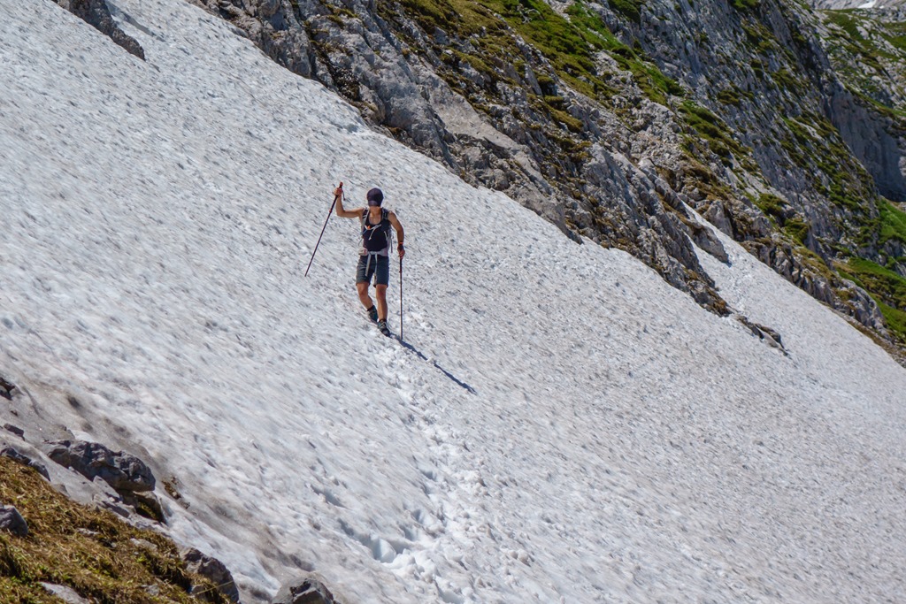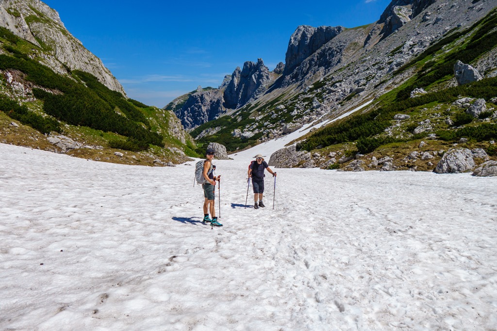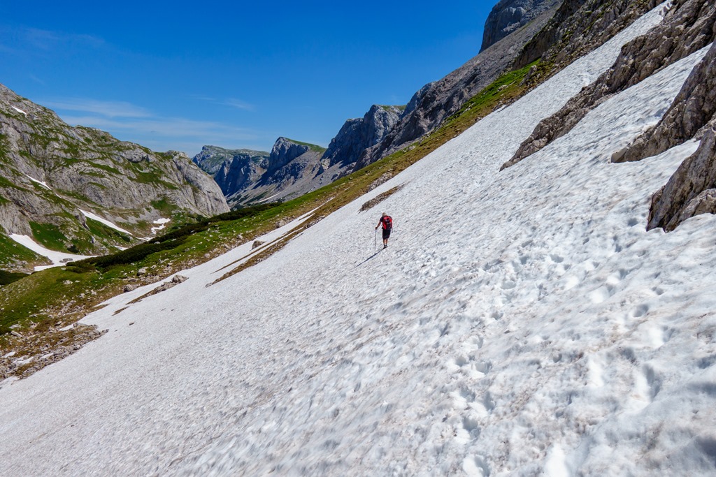Megelégedéssel nyugtázom, amikor elérjük a Dullwitzban futó hivatalosan is jelzett turistautat (13:30), ami szerpentinekben ugyancsak rendesen zuhan az árok mélye felé, majd később jó hosszú szakaszon hómezővel borított. A télies lejtő keresztezése jó odafigyelést igényel, de elvileg nem igazán veszélyes. Egy esetleges kicsúszás ugyan semmiképpen sem ajánlott, de itt nem jelent halálos balesetet, mivel cirka 30-40 méter szánkázás után a csúszda a Dullwitz legalján érne véget.
