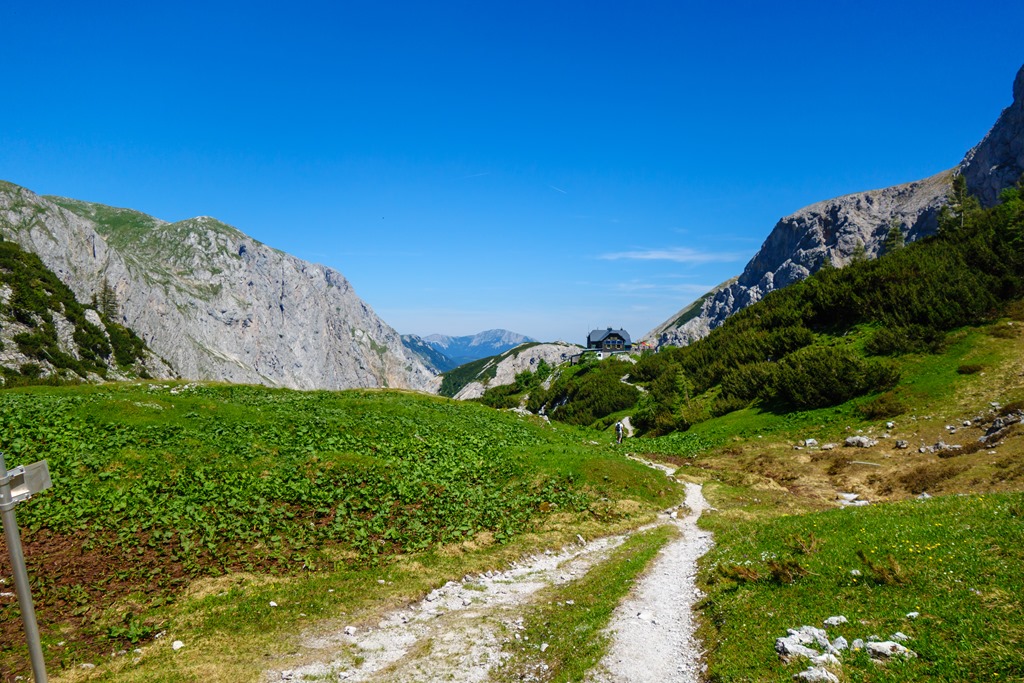 Kénytelen-kelletlen kerekdpnk fel tehát, hogy a nap legmelegebb szakában, tegyük meg az azaznapi utolsó felvonásnak számító, majdnem 3 órás, a Fölzklammba visszavezető utat (lenti képen visszapillantásban a Voisthalerhütte).