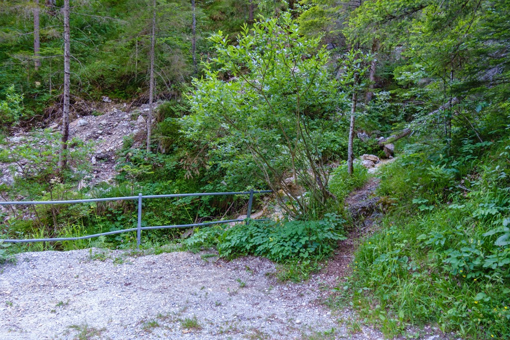 Az aprócska bonyodalom oka, hogy az említett villanytelep épületét időközben lebontották és így már nem szolgálhat tájékozódási pontként. Annyit viszont tudni lehet, hogy a Mitterbach patak folyása szerinti bal oldalon, azaz a turistaútról nézve a jobb oldalán kell felfelé kaptatnunk. Így aztán a jelöletlen, de mindvégig jól követhető csapás kezdetét szinte elvéteni sem lehet, mert közvetlenül a Mitterbach patakon átívelő híd után indít (fenti kép az ösvény beszállójával a korlát mellett).