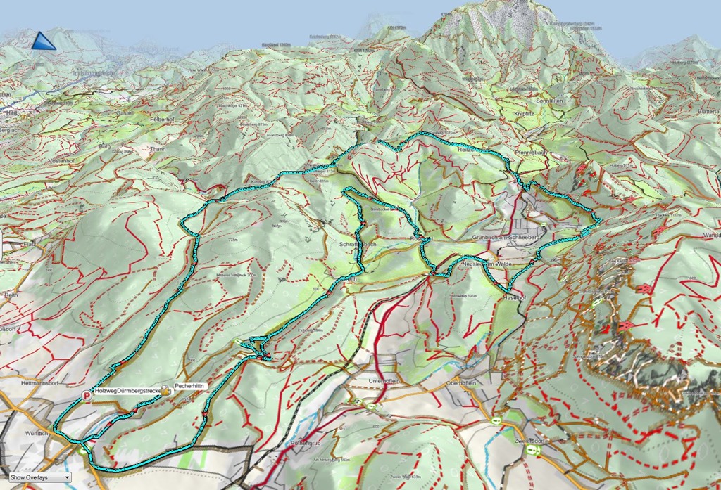 A Würflach melletti Dürrenberg (844m) és a róla elnevezett Dürrnberg-Strecke nem összekeverendő sem Dürrensteinnel (1878m) sem pedig Dürnsteinnel (a Wachauban). A hivatalosan is jelölt Dürrnberg hegyi biciklis körút önmagában túl rövid ahhoz, hogy fél napra ideránduljak, ezért kibővítem a szomszédos körök egyikével, mégpedig a Schwarzes Gold-Streckevel. Így összetapasztva a kettőt már 30 km fölé tornássza magát a pálya hossza és időben feltételezem, hogy legalább három vagy három és félórámba fog kerülni a megtétele.