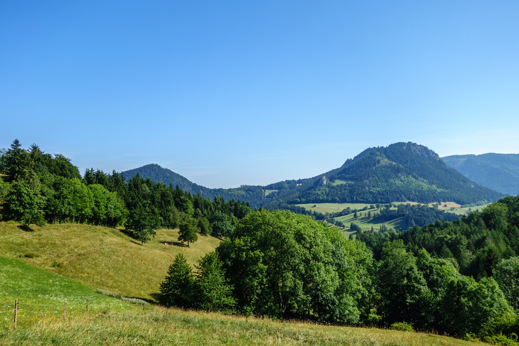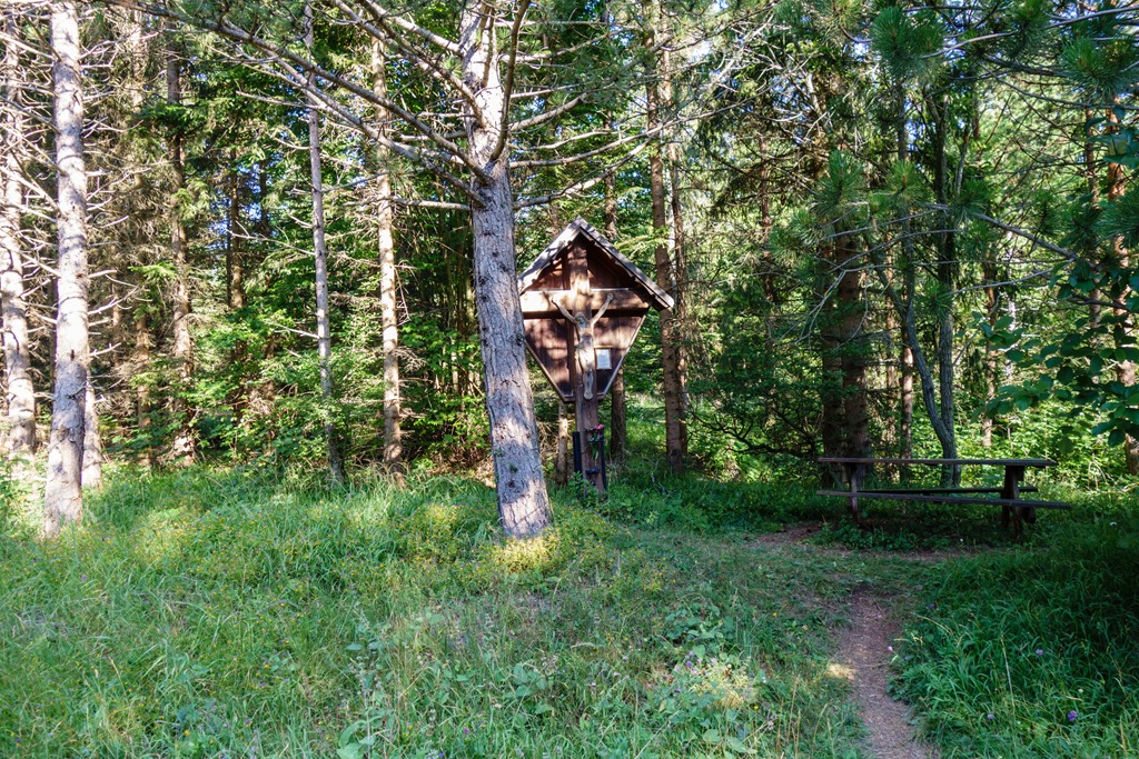 Nos az ecsetelt bonyodalmak, elvétett utak, miegymásnak köszönhetően nem érkezem 11 órára a Hüttebe, hanem csak 11:20-kor. Na, bumm! Már jó sokan ücsörögnek az asztaloknál, de egy személynek mindig akad hely. Cirka félórás ebédszünetem után bevallom, nehezemre esik a kiindulópontomig tartó rövidke aszfalt kaptató. Jó kis kör, ha legközelebb újra csinálnám, akkor a „dombot” legalább parciálisan okvetlen kikerülöm. A térkép szerint vezet ott egy bypass erdészeti út is a tetőre, hátha szelídebb.