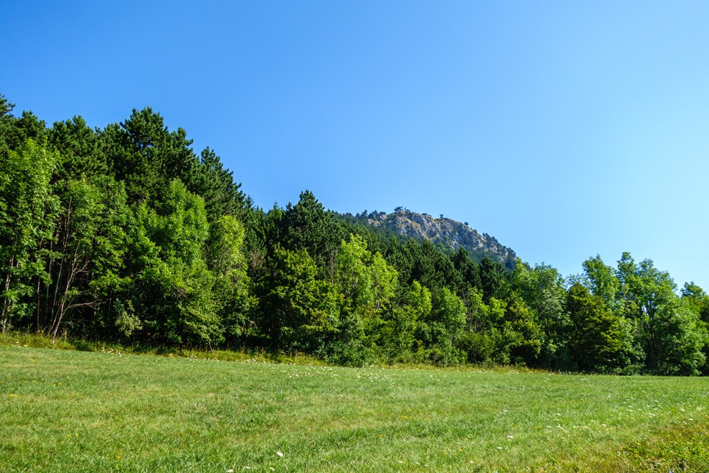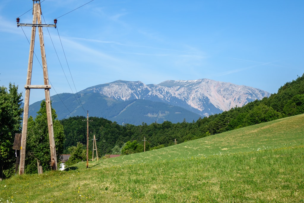 Egyébként a panorámára panaszom nem lehet. Két-három helyen is beúszik a Schneeberg, majd pedig a Hohe Wand nyugati része a szirten helyet foglaló Geländehüttevel, (fenti képek) mivelhogy éppen a Wand falai alatt fut a kijelölt utam. Árnyékom is akad elég, hisz túlnyomórészt erdőben nyomom a pedált (lenti kép). Még kiemelném, hogy alig-alig van közúti rész, ha van is, csak nagyon rövidke szakaszokon. Az aszfaltburkolat részaránya is inkább elenyésző.