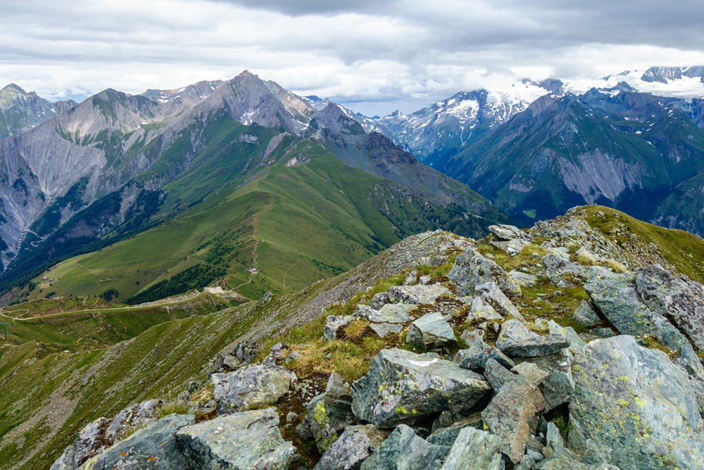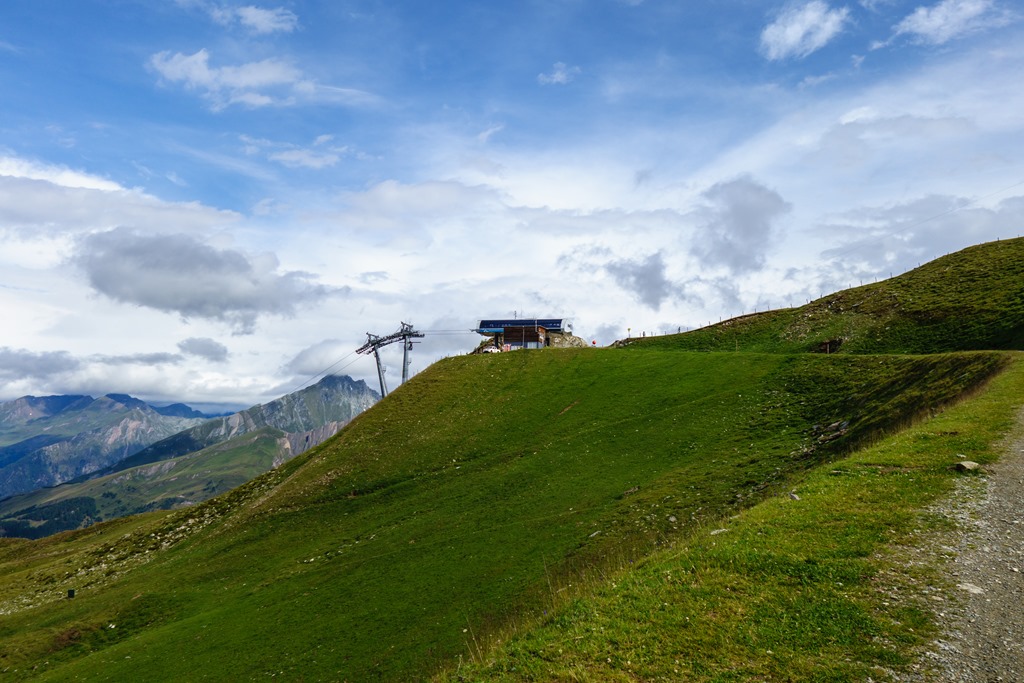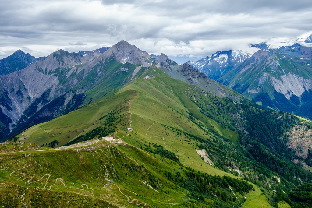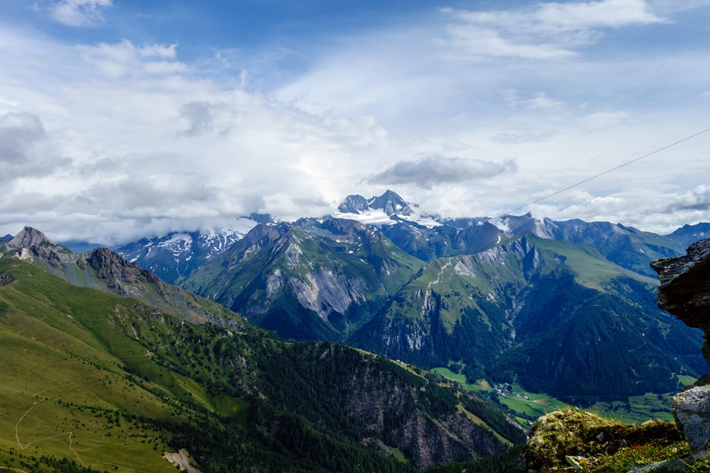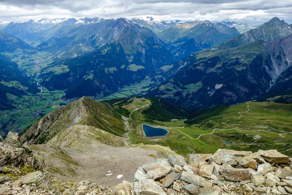 Pillantás a csúcsról a Goldried hegyi állomás felé, balról a Virgental