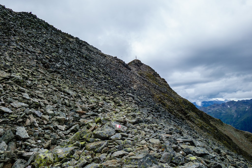 Pár vállalkozó kedvű túrázó somfordál előttem, előzök. Valamennyien a Gornerig mennek csak (ez elbizonytalanít), aztán ott álldogálnak tanácstalanul, mert nem tudják hol van a Gorner csúcsa. Az út ugyanis a Gorner alatt vezet a Rotenkogel felé és csak egy alig látható csapás (amit meg kell találni) mutatja az irányt a kereszt és kőhalom nélküli kopár Gornerre.