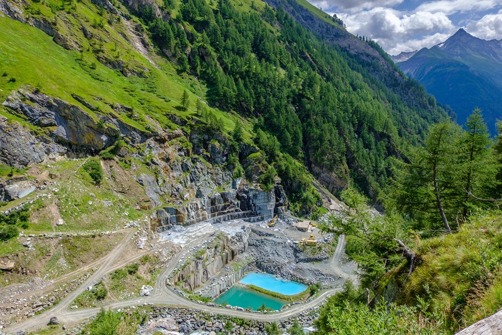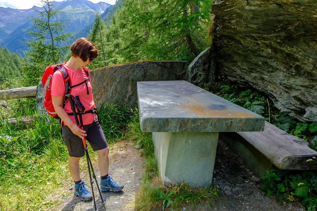 Később egy tábla átterel minket egy 2000-ben épült hídon (Venedigerbrücke) a patak túlsó, jobb oldalára. Az eredeti ösvény továbbra is a bal parton, egy kőbánya mellett és felett fut, de kőomlás veszélye miatt le van zárva. A kőbányában hatalmas lapokat fejtenek le a sziklaalapzatról. Nem tudom, vajon márvány-e avagy valami más. Nem értek hozzá.