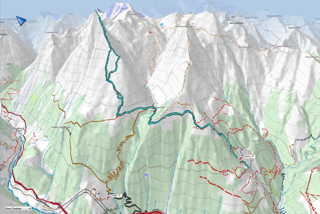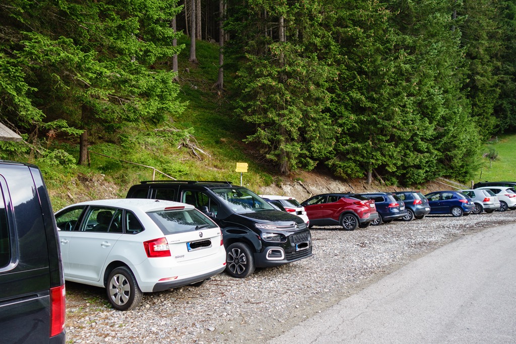 A Glanz (csillogás) nevezetű, 1520 m szinten fekvő parkolóból indulnék, ha reggeli érkezésemkor már nem lenne színültig tele (fenti kép). Egy gombostűt leejteni nem lehetne. A dolog kulcsa, hogy vasárnap van, kiválóan jó túra idővel. Mindenki a hegyekbe igyekszik, és sokan ott is éjszakáznak valamely turistaházban. Tanakodok egy darabig, vajon most, mitévő legyek? Ereszkedem lassan visszafelé és lesem az utat alkalmas beszögellések felfedezése céljából, és igen, találok is egy ilyen, pont egyetlen autónak megfelelő Platzerlt.