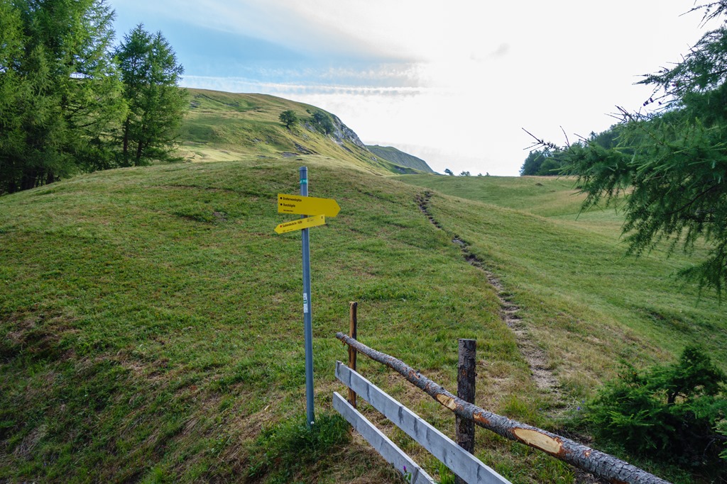 Miután az első számú feladatot sikerrel megoldottam, jöhet a többi. Meredek erdei kaptatón érkezem a Bretterwandspitzere 2887m (egy majdani cél, fenti képen) vezető leágazáshoz. Hivatalosan oda sem vezet jelölt út, de mint látom tábla és jól kitaposott ösvény mégis van. Folytatom utam még abban a szerény hitben, hogy esetleg a Nussingkogelre is találok majd valamiféle hasonló utalásokat, de ez nem igazolódik be.