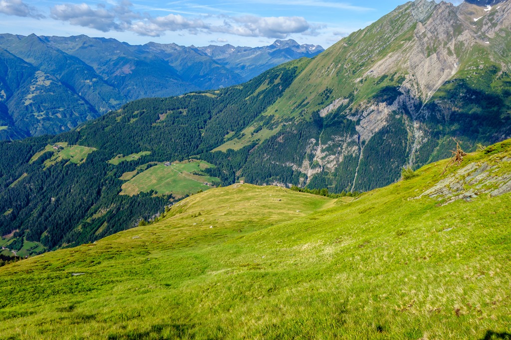 Miután fizettem, komótos tempóban bandukolok tovább. Egyszerűen csak hagyom, hogy a világ eme csodái hassanak az érzékeimre. Elégedett vagyok. Az Edelweißwiesen, ahol tudniillik most nincs havasi gyopár, még belevetem magam a fűbe és pihengélek a melengető napon (lenti kép). Néhány perc után azonban mégis tovább kell állnom. Még egy óra ereszkedés Glanz.