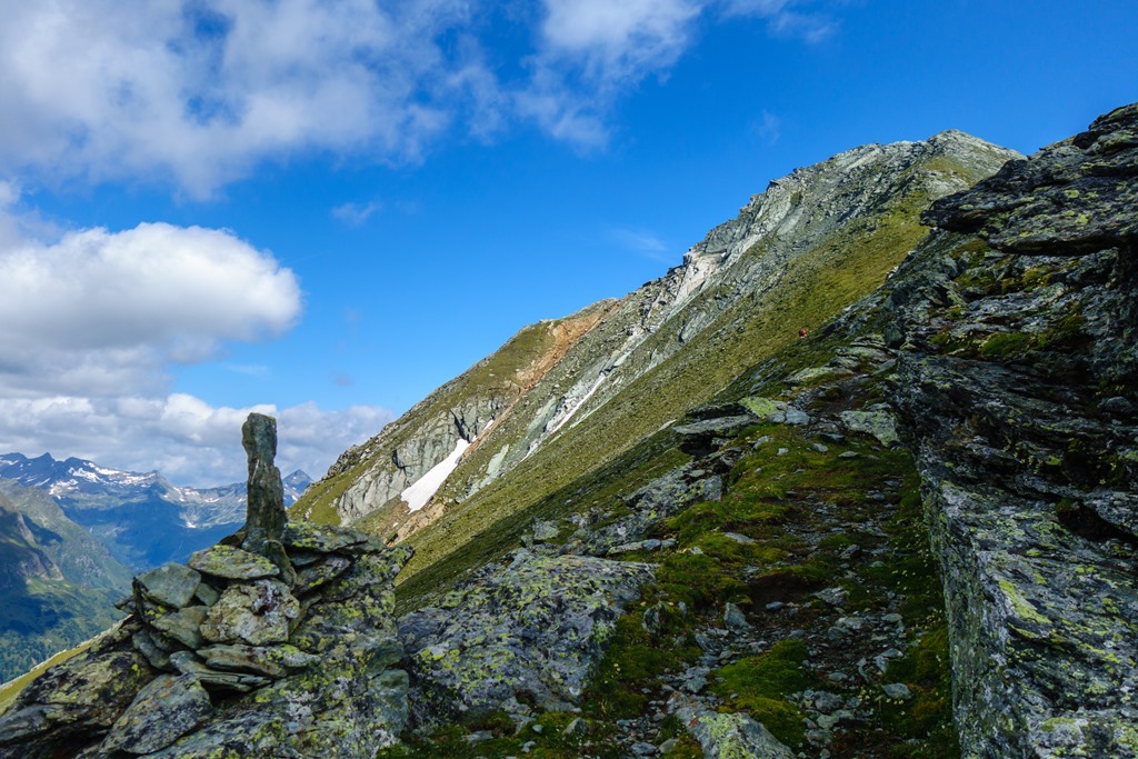 Ezután következik a túra kellemsebb, szorongásoktól mentes része. Beveszem az irányt a Steiner Almra, ahol megejtem mind a szükséges elektrolitok, mind pedig a kalóriák utántöltését. Pihengetek egy teljes órán át a napos teraszon és csak nézek ki a fejemből, gyönyörködöm tudatosan is a környezetben, a hegyekben, a távoli hegycsúcsokban. Látom a Bretterwandspitzet, a Sudentendeutschehüttet és mellette minden bizonnyal a Wellachköpfet, egy betervezett igazi háromezres (tán majd jövőre).