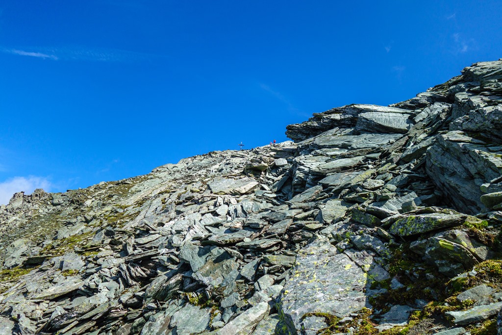 - A második él pedig a csúcs sziklás felépítményében leledzik. Mivelhogy az utolsó 100-150 m szint egy szikla labirintusban vezet, és a megszokott piros jelek hiányában nem mindig lehet tudni, hogy jó csapáson vagyok-e. Közvetlenül a csúcs alatt sikerül is mellé mennem és egy laza sziklagörgeteg szélén találom magam. A görgeteg optikája elég jól néz ki (egy ilyen magashegyi alakulathoz nem szokott zöldfülű számára), de mind állagban mind pedig színében elüt a Schneeberg/Rax/Hochschwabon megszokottaktól. Sötétebb és nagyobb szikladarabokból áll. A csúcs már karnyújtásnyira, csak a görgeteg választ még el. Alig lépek bele, megindul alattam az egész. Ujj! Szerencsére a szélén vagyok és találok fogódzót, amivel némi küszködés után sikerül kijönnöm a sziklafolyóból. Később, lefelé jövet látom, hol vétettem el. Egy ponton egy balról hívogató szokatlanul sík terep vonta el a figyelmem akkor, amikor jobbra fel, egy sziklafolyosón kellet volna feljebb másznom. Tanácsom tehát, a csúcskeresztet inkább jobb oldalról és nem direkt/balról kell megközelíteni!