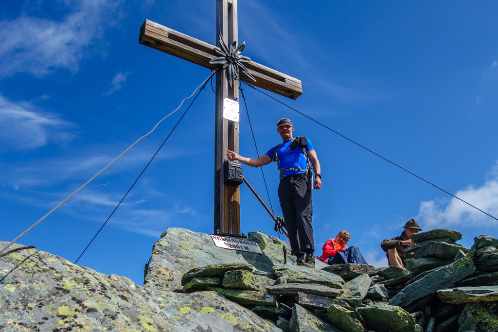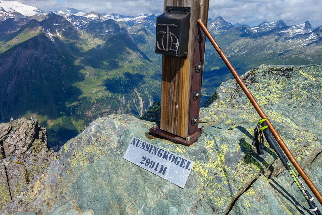 Kilenc, azazhogy tizenegy csekélyke méter híján a Nussingkogel majdnem egy háromezres, de hivatalosan mégsem az. A térképeken 2989 m magas, viszont odafenn, a csúcskereszten, tanúsíthatom, 2991 m van feltüntetve.