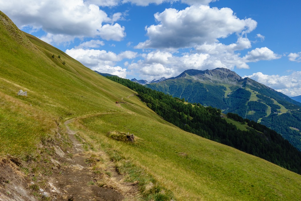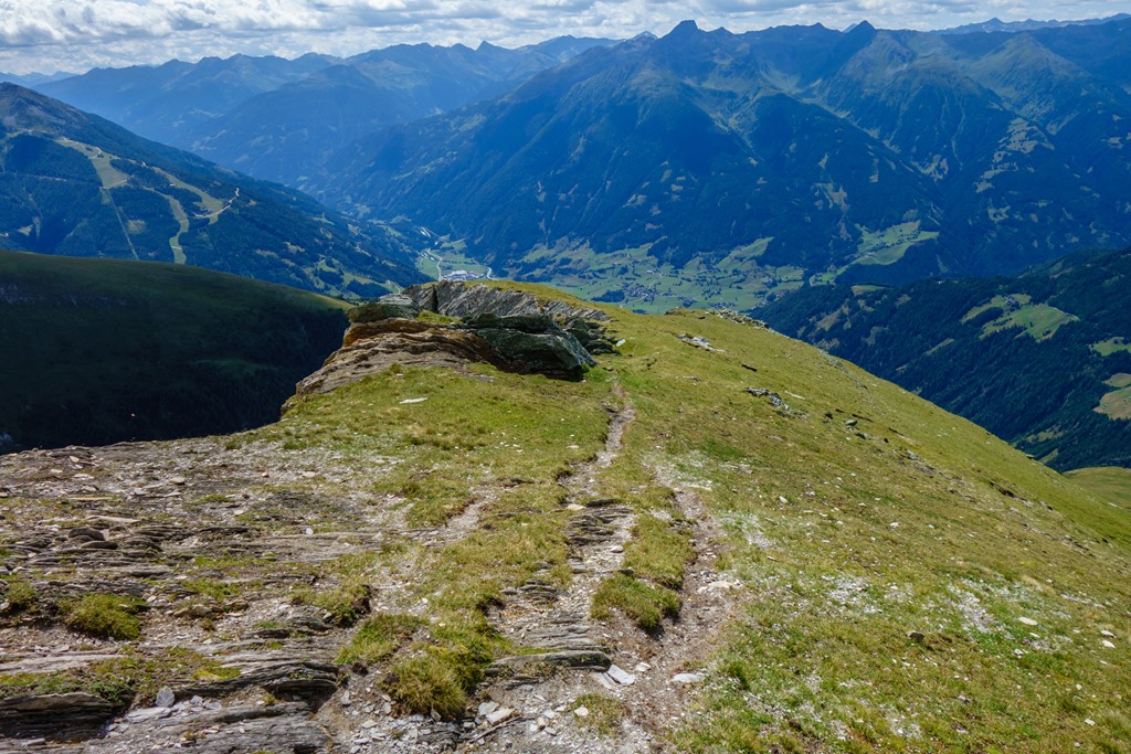 A nagy kérdés, hogy miként válasszam meg a visszafelé vezető utam, hol hagyjam el a gerincet, mikor kezdjem meg az ereszkedést a hegyháton. Úgy döntök, követem a látható ösvényt, mindaddig, amíg csak lehet (lenti kép). Nem biztos, hogy jó döntés volt. A csapás ugyanis egy helyen a semmibe foszlik, csak zöldellő rét van előttem. Nincs több követhető nyom.