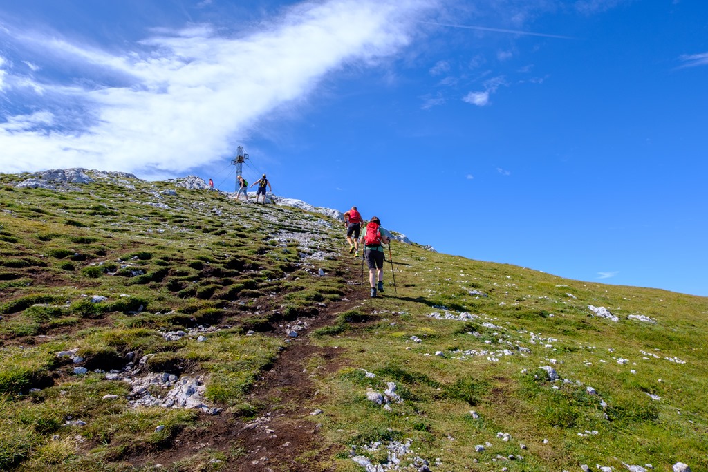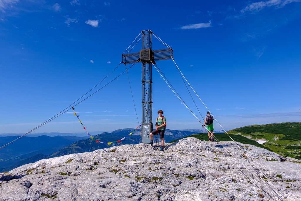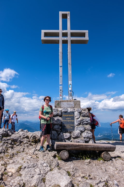 Az út a Kaisersteintől a Klosterwappenig mindössze 20 perc. A kötelező csúcskereszt fotó után még levetjük magunkat a fűbe és csak élvezzük a kellemes időt, a kék eget, a napsütést a tájat.