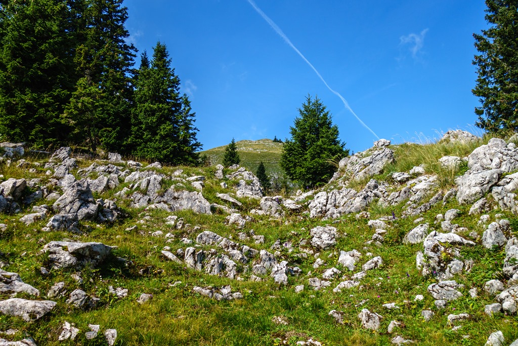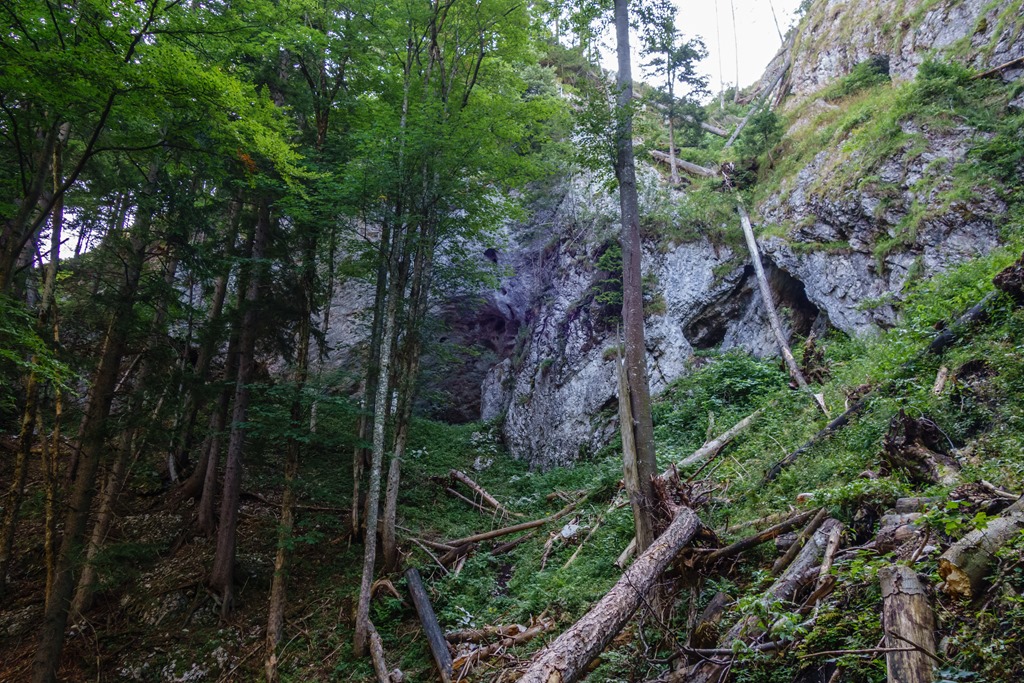 Két hajtűkanyarban visz fel az út egy kisebb-nagyobb lyukakkal és barlangokkal tarkított sziklafal tövébe, majd alatta tovább, amíg vége szakad az erdőnek. Egy derékig érő növényzetű salátáson át vezet a továbbra is jól követhetőd nyomvonal (fenti kép). A leveleken összegyűlt harmattól úgy lyukadok ki egy széles erdészeti útra, mintha egy kanna vízzel locsoltak volna meg. Sebaj, ma kánikulát igért az előrejelzés, hamar megszáradok.