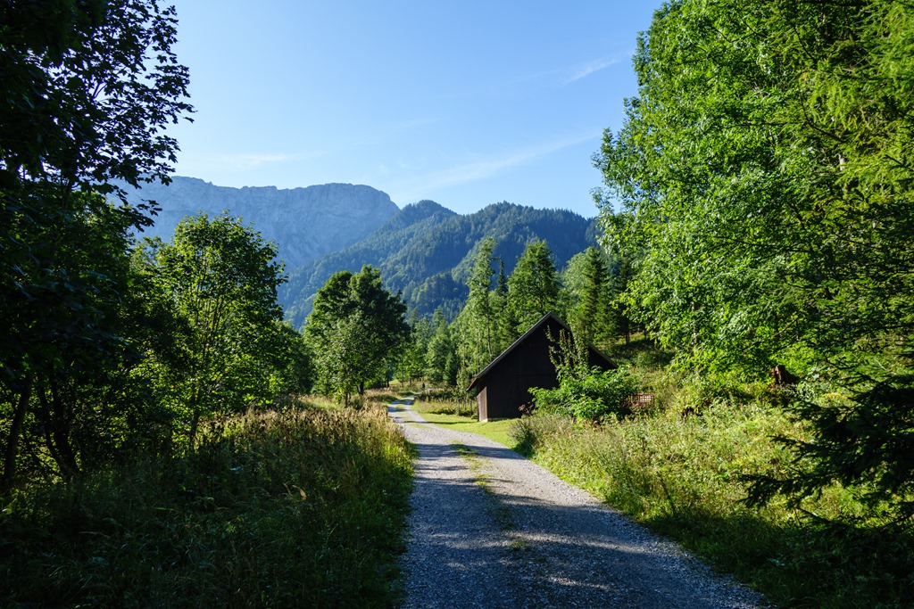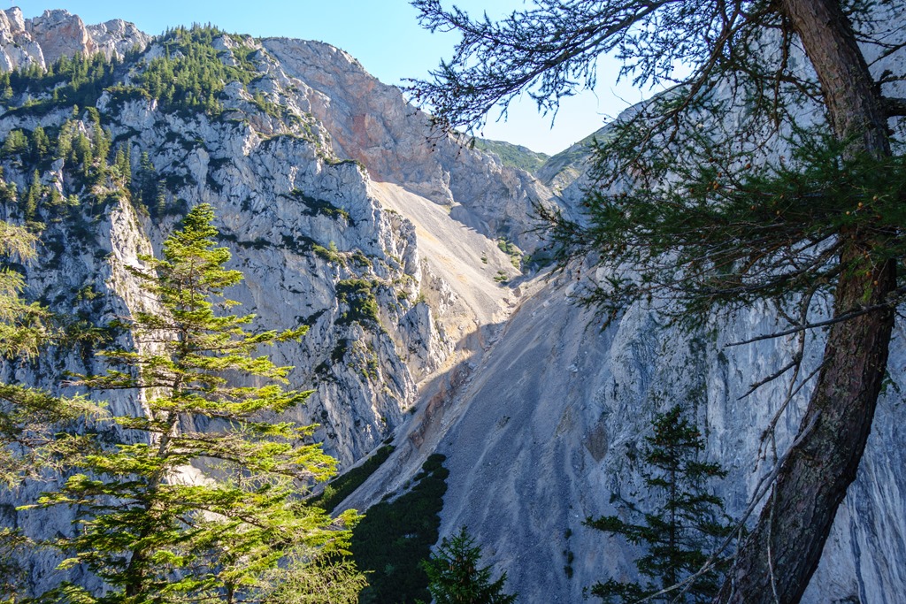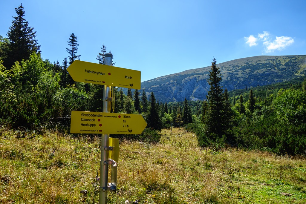 Már elmúlik 9:00 óra is (fenti kép) amikor ilyen szokatlanul későn elindulok Hinternaßwaldból. A Reißtalklammon át menetelek a Kahlmäuer falai felé. Elhaladok a Habsburghaust ellátó kötélpálya völgyi állomása mellett majd erdőben, enyhe kaptatón érkezem a sárga táblával jelzett elágazáshoz (10:15), mely a Wildfährte beszállójához vezet. A turistaút innentől kezdve embert, erőt, kitartást követel, mert nemcsak egyszerűen felfelé kunkorodik, hanem lazán ülő, sziklamorzsalék is megnehezíti a rajta való közlekedést.