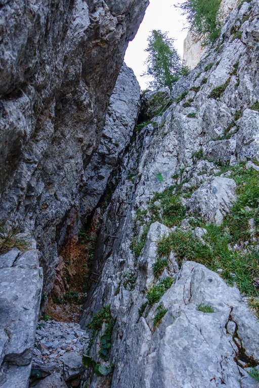 Kellemetlen morzsalékos ereszkedő következik majd egy bevágásban (fenti kép közepén) visz felfelé a drótkötél. Ezután érkezem a kulcsszakaszhoz mely egy szűk sziklahasadék jobb oldalán fut (lenti képek). Némi kihívás átpréselni magam az itt nyíló hasadékon, hogy a drótkötéllel biztosított szakasz aljához érjek.
