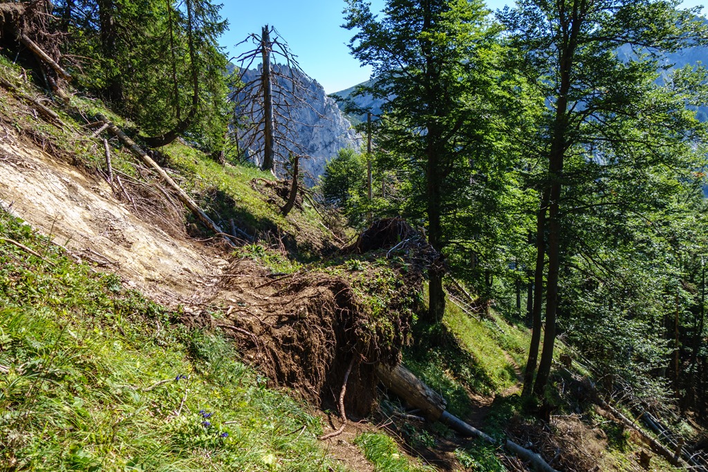 13:45-kor bevégeztetett a pihenésnek és szép nyugodt tempóban elindulok lefelé a Kaisersteigen. A drótkötéllel biztosított szakaszok után meglepetésként ér a viharverés okozta hatalmas károk látványa (lenti képek).