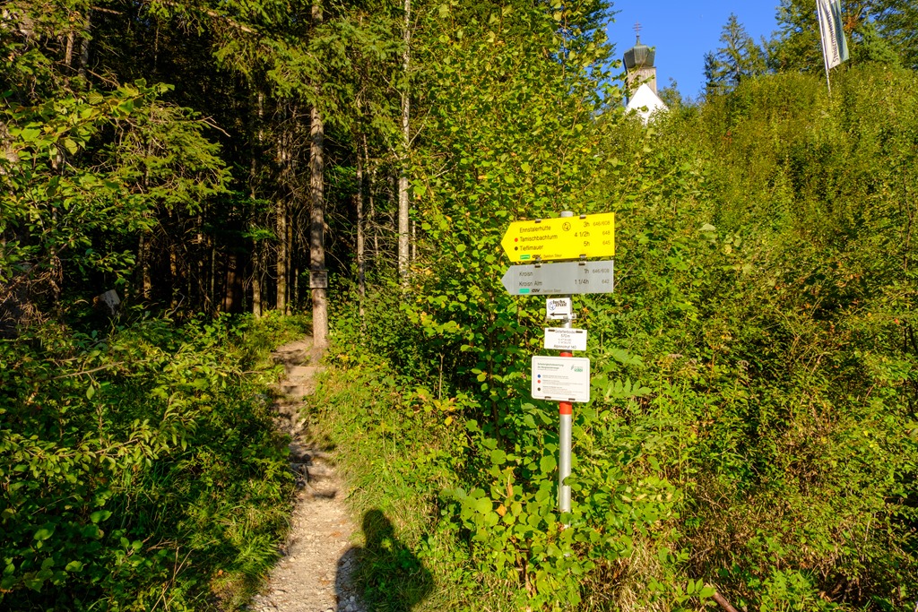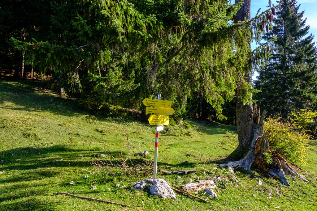 Folytatom utam a Hochscheibenalmig (fenti képek), majd ezt követően még néhány percig a Hieflauba vezető erdészeti úton poroszkálok. Egy sárga útjelző táblákkal ellátott helyen kezdődik a túra követelményeket támasztó része (lenti kép – ott balra fel).