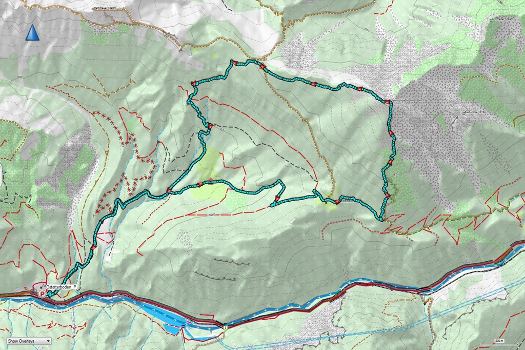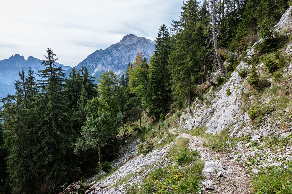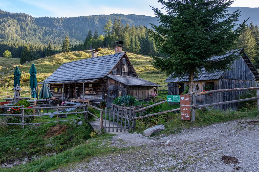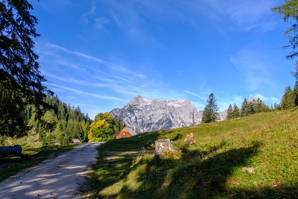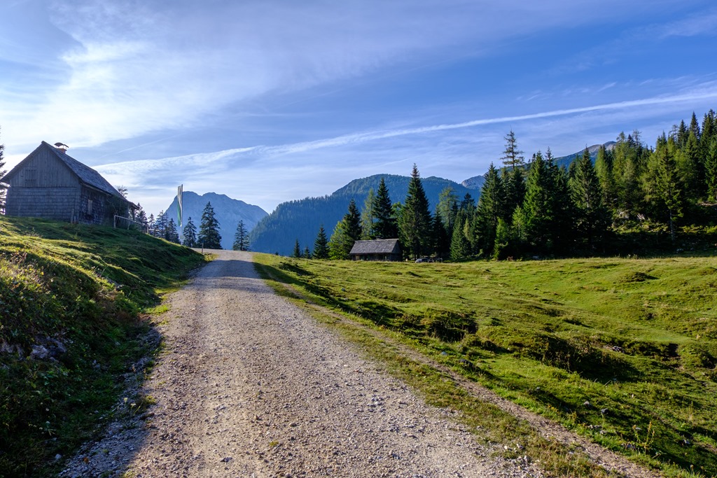 A Gstatterbodenból keleti irányba indulok, majd hamarosan az időszakos Weißenbachl patak medrét keresztezem. Rövid szakaszon erdőben felfelé. Egy széles erdészeti úton folytatom egy kereszteződésig, ahol balra leválik a standardút. Én jobbra tartok a Kroisenalm és a Hochscheibenalm felé (fenti kép).