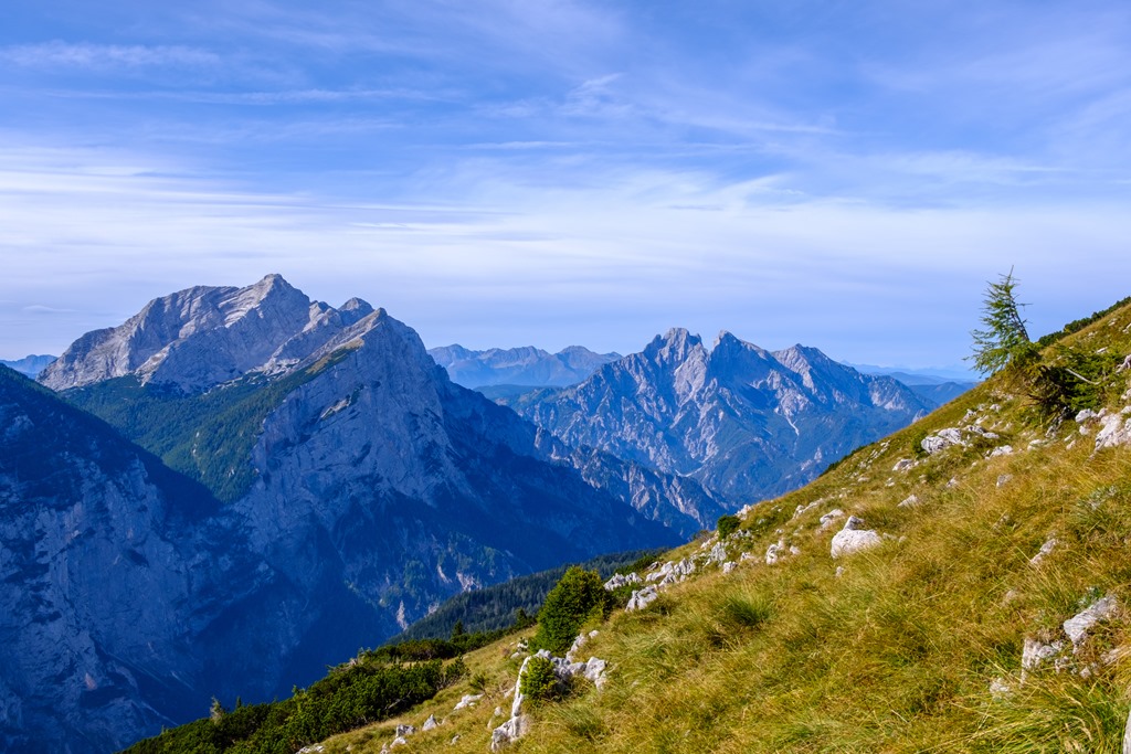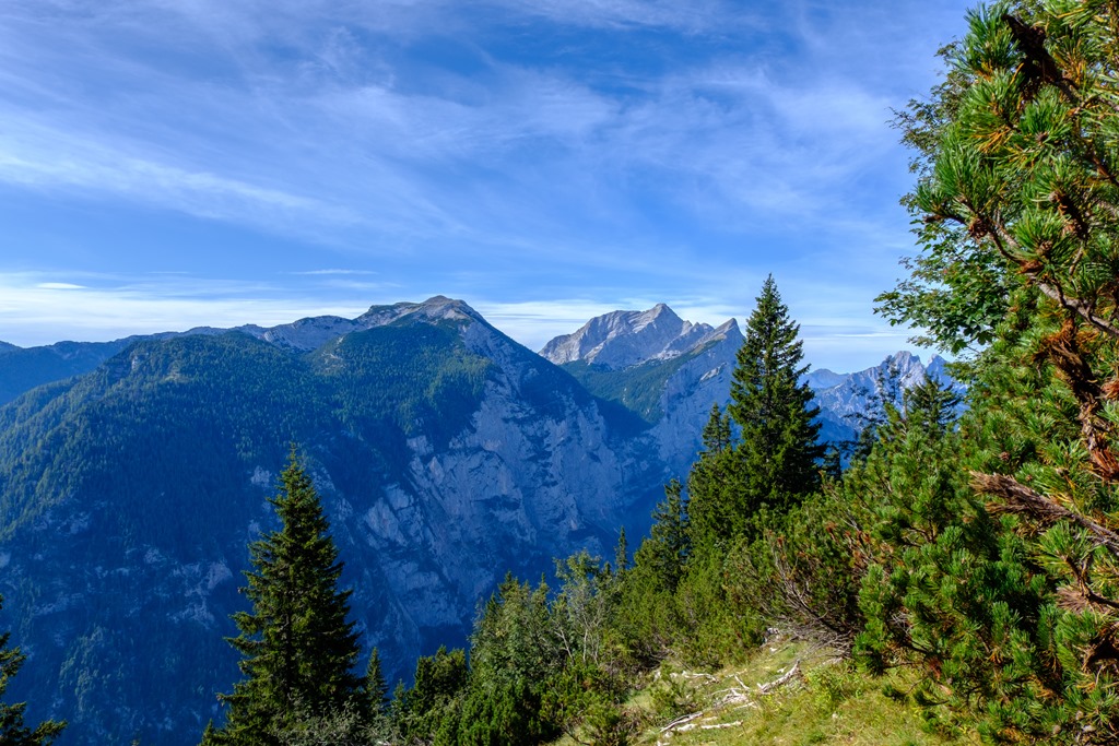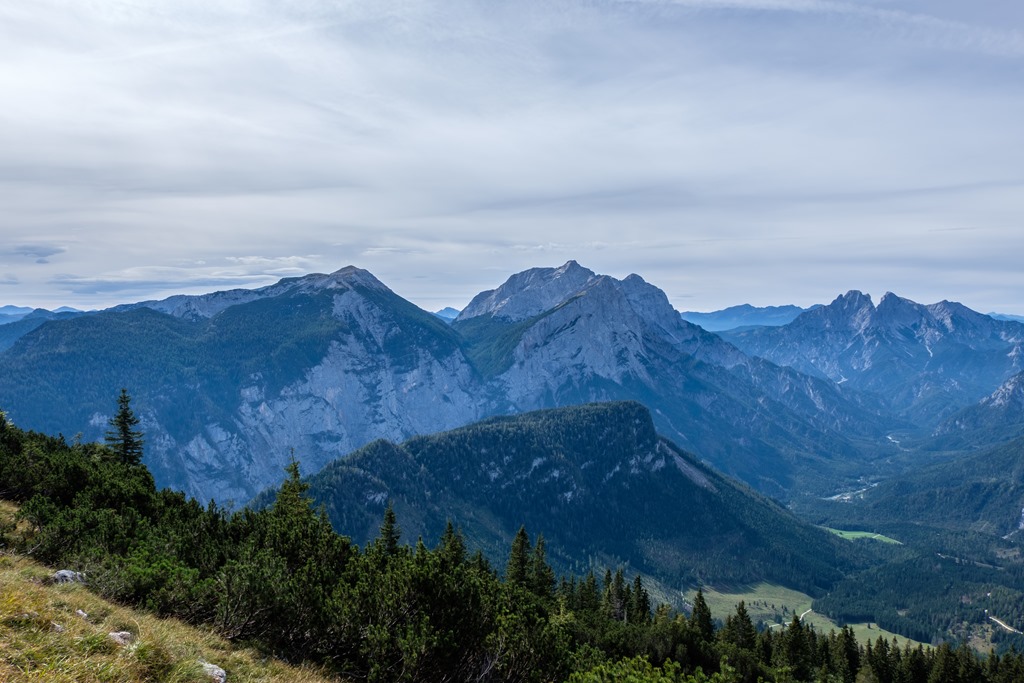 A kaptatás során nyert szintemelkedésre utal, hogy gyérülnek, el-eltünedeznek a fák, majd törpefenyős cserjés köszönt (fenti kép). Kezd kinyílni a táj, balról előbukkannak a Gesäusebrge nagy nyers hegyei, a Planspitze, a Hochstor, a Hochzinödl, a Lugauer, az Admonter Recihenstein/Sparafeld kettős csúcsa majd utolsónak a Großer Buchstein is (lenti képek).