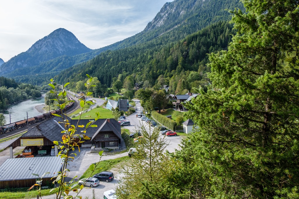 A Gstatterboden, balról az Enns, a kép közepén a parkoló végében a Nemzeti Park Központ
