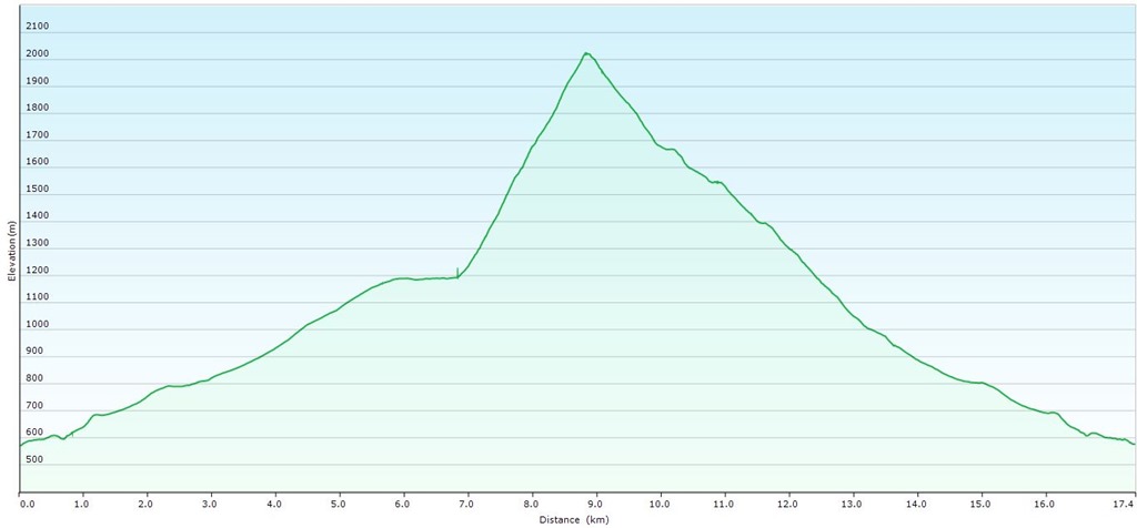 11:15-kor érkezem a csúcsra, azaz indulástól számítva 3:30 óra alatt. Ez egy teljes órával kevesebb mint azt az odalenn kitett táblák hirdetik. Vasárnap és kiváló túraidő lévén nagyobb csoportok érkeztét várnám a standardúton, de csak egy fiatal párocska ücsörög a kereszt alatt. Távcsővel pásztázzák a vidéket. A jelentős fátyolfelhősödés ellenére is jól érződik a nap langymelege. A szél csak itt-ott lebben hűsítőnek. Le lehet ülni a fűbe és majszolni valamit az otthonról hozott elemózsiából. Pont ilyen viszonyokat képzeltem el magamnak. Nagyon jól érzem magam, mert nincs az időjárás okozta kényszer (mint oly sok esetben) gyorsan elhagyni a szirteket.