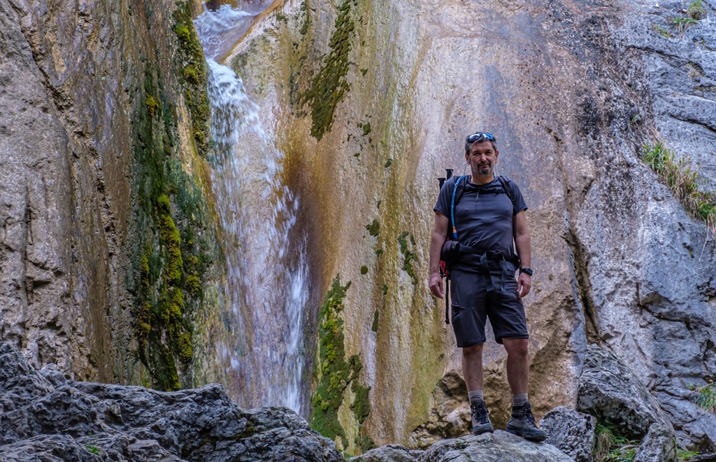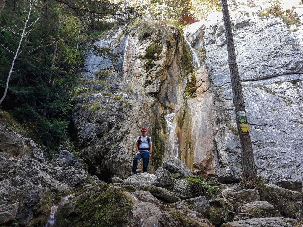 14:37-kor érkezünk a vízeséshez, melyet a hasonnevű patak táplál. Tavasszal, hóolvadáskor nyilván bőségesebb a vízkészlete, ám most is csordogál rendesen az évszázadok alatt sziklába vájt csatornán.