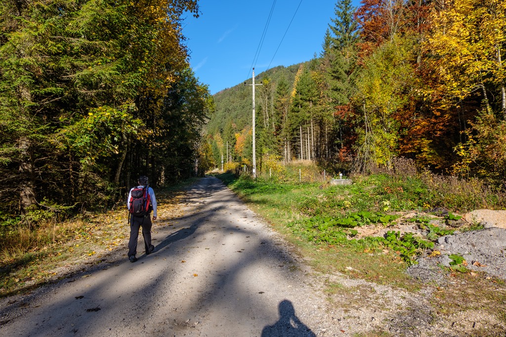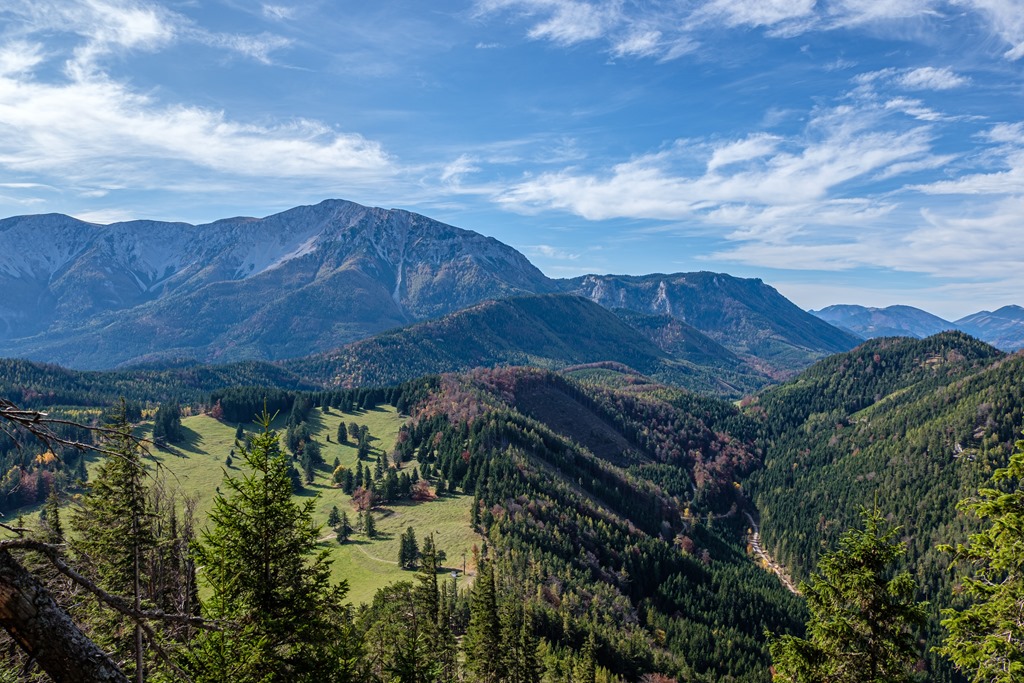 Csendes, az aranysárga színárnyalatiban gazdag őszben, 8:50-kor indulunk aznapi körünkre. A Sierningtalban eleinte aszfaltúton bandukolunk enyhe, alig-alig észrevehető emelkedőn (lenti képen kilátás a Sierningtalból a Schneebergre).