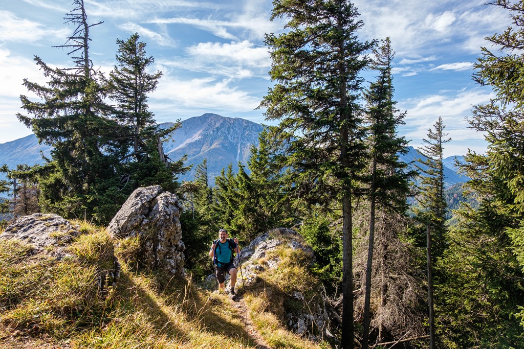 Napsütötte hegyháton, egyre feljebb dolgozzuk magunkat és alig félóra elteltével, 10:55-kor kilyukadunk az 1183 m magas Öhler tetején. Gyönyörű Schneeberg látvány fogad (lenti képek).