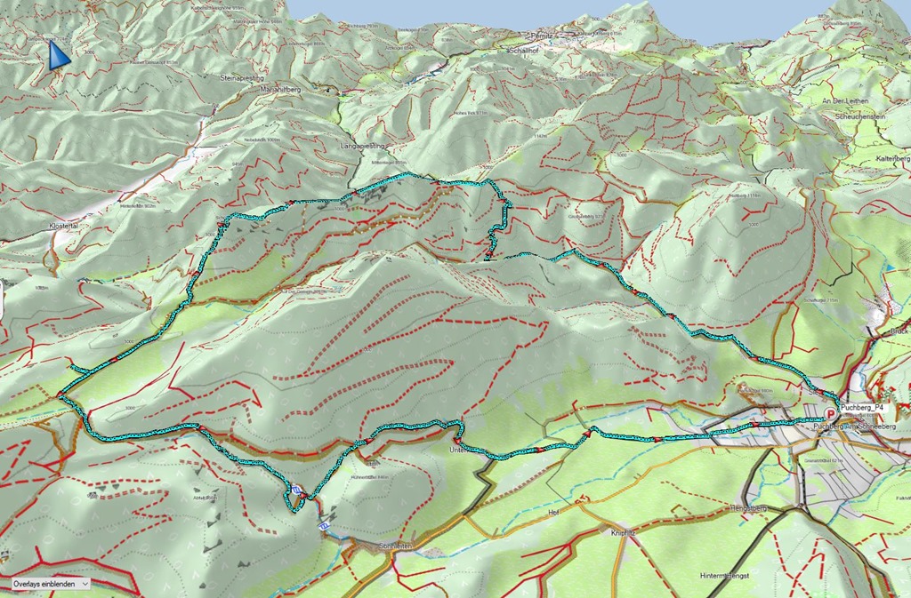 A vízeséstől nem a lezser, magától értődő ereszkedést választjuk a Wasserfallwirt felé, hanem egy cirka 100 m szintemelkedés árán visszakapaszkodunk a Römerwegre, majd erdőn át lassú ereszkedéssel lyukadunk ki az aszfaltútra Puchberg felé. Kerülőnk előnye, hogy így megspórolunk egy szakasznyi unalmas aszfaltutat. 16:10-kor érkezünk vissza reggeli kiindulópontunkba.