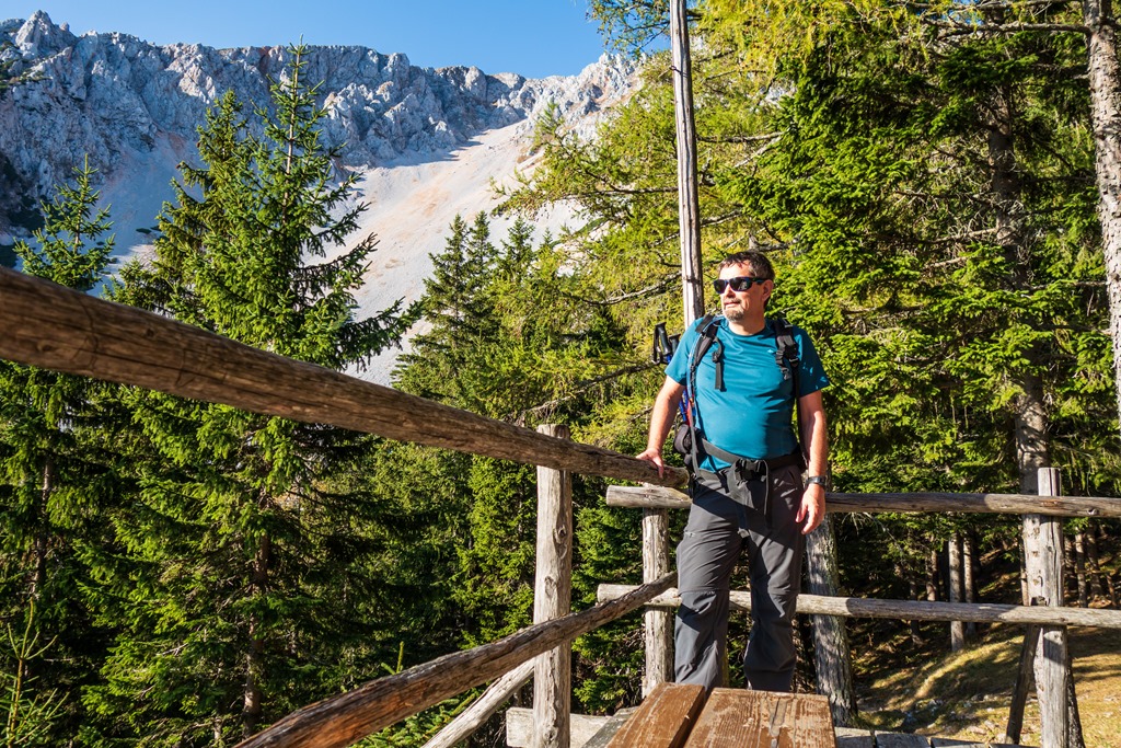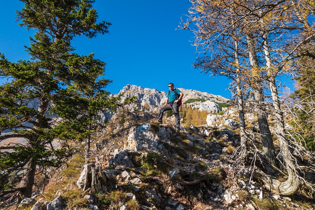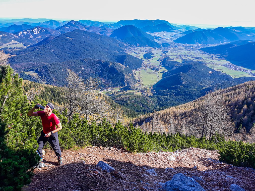Egy keskeny törpefenyő utcácskában folytatjuk jobbra tartva egészen egy markáns sziklaszirtig, ami nem más a mint a tulajdonképpeni Nandl-gerinc nyúlványa. Átmászunk rajta. A túlsó oldalon azonnal balra és határozottan felfelé kunkorodik az út. Itt kezdődik a túra nehezebb, de mindenképpen élvezetesebb része. Előtte még szusszanunk egyet és szomjunkat oltjuk, aztán jöhet a lényeg (lenti kép).