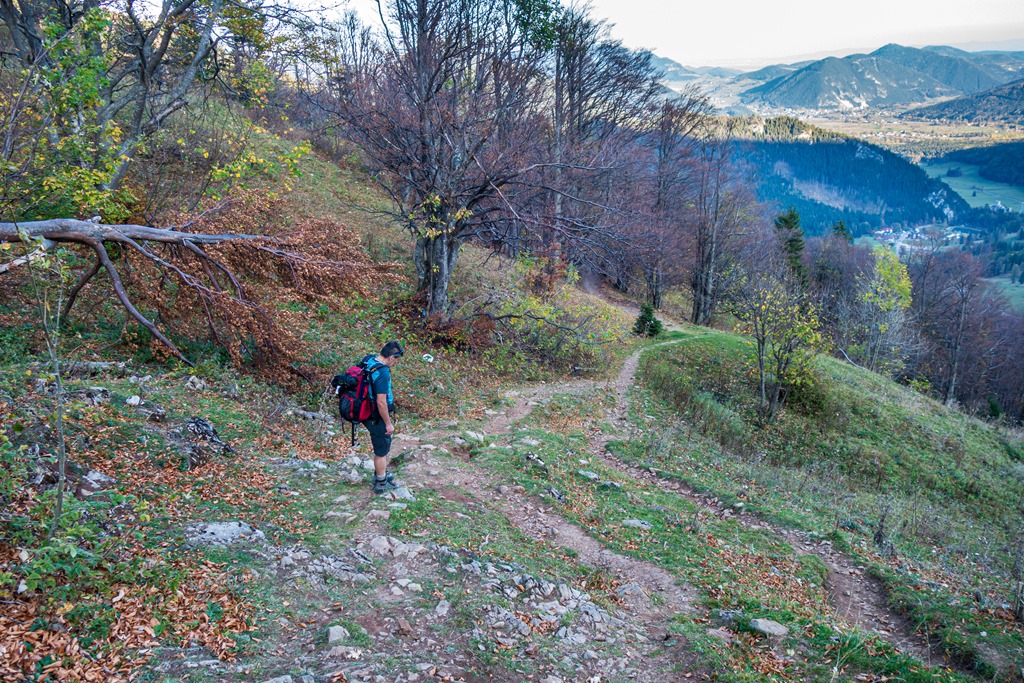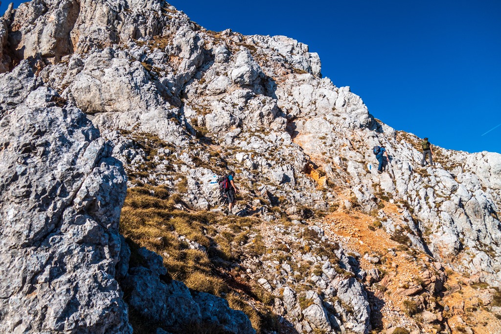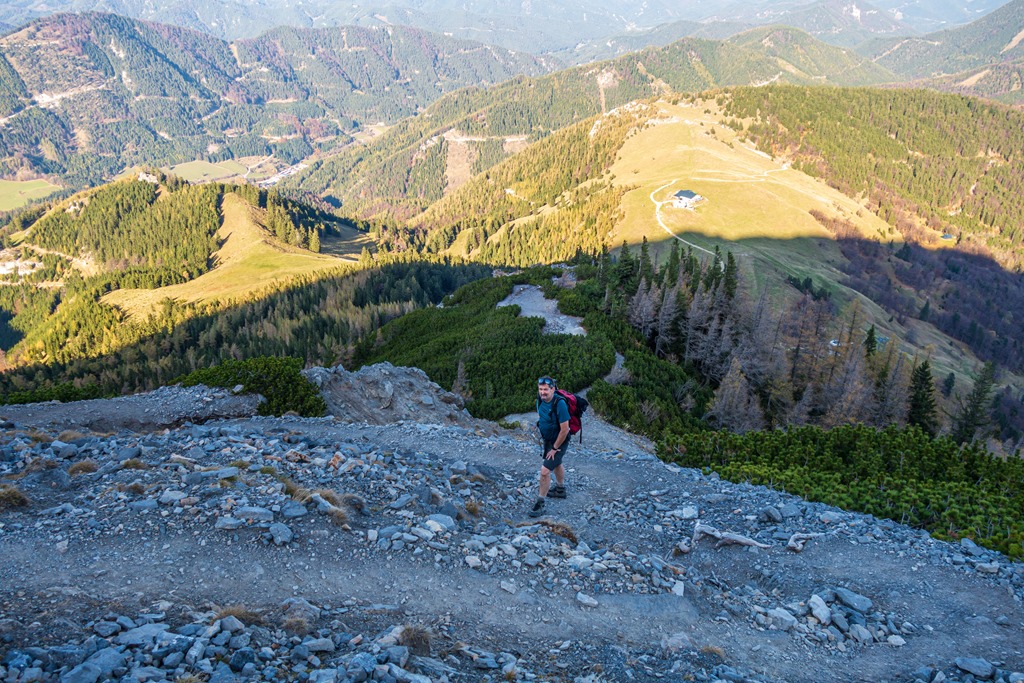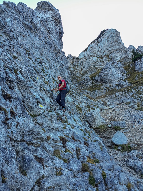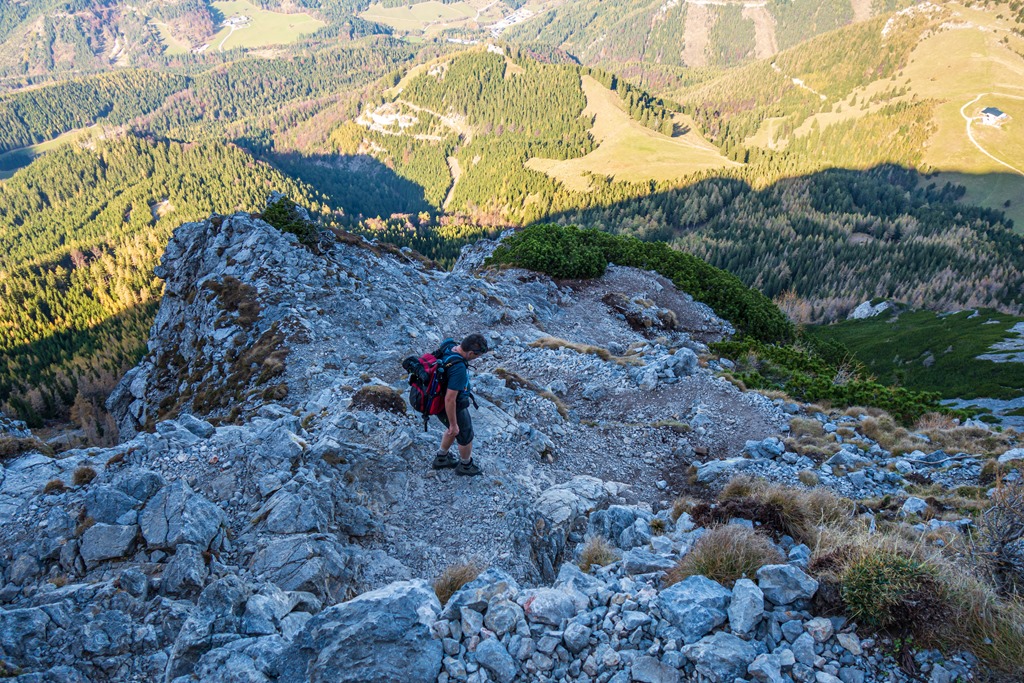 Lefelé két útvariáns jön szóba. Az egyik, a lankásabb, de hosszabb Schauerstein – Fadenweg, illetve a másik a nehezebb Fadensteigen történő ereszkedés. Szinte gondolkodás nélkül az utóbbira voksolunk.