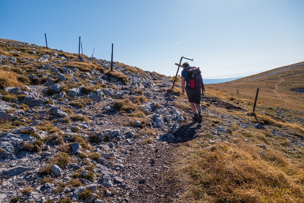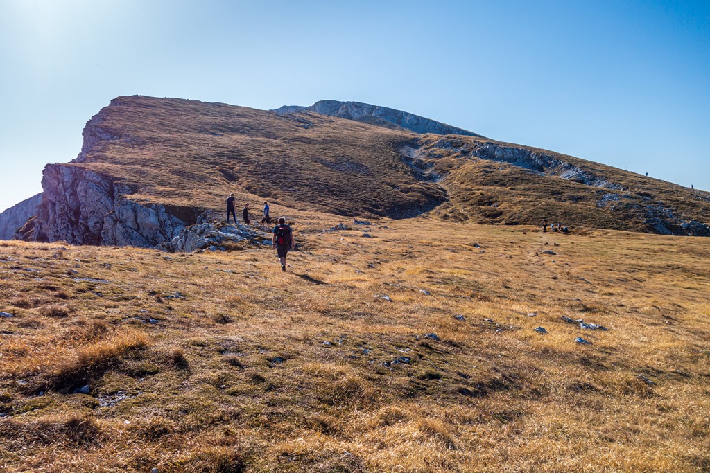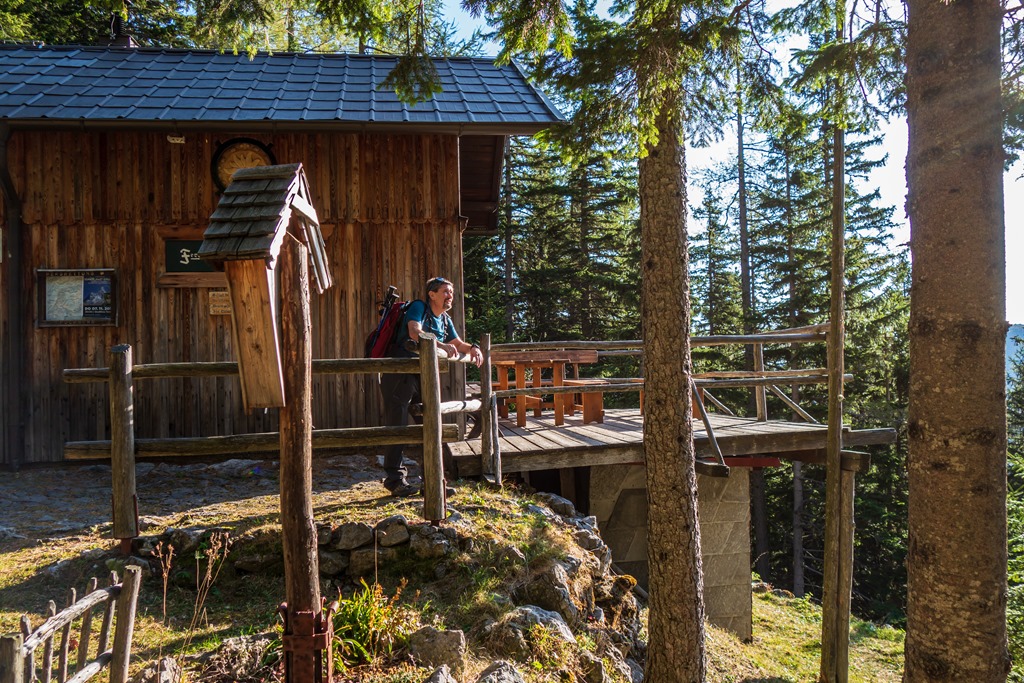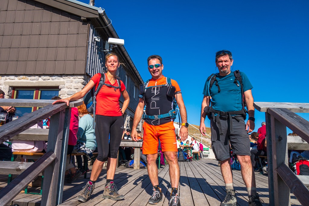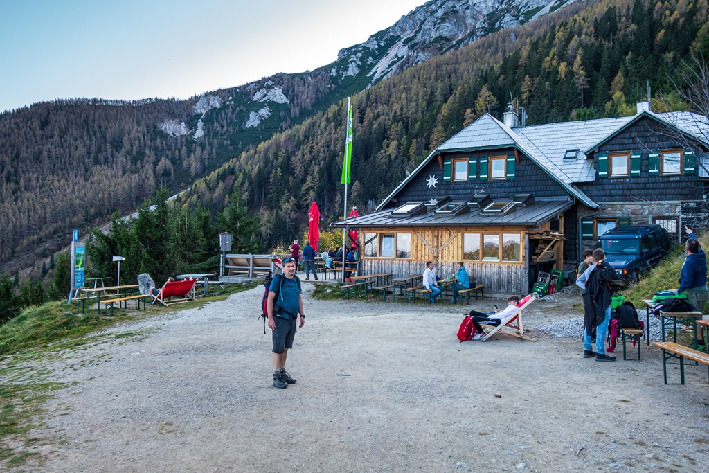 Attilával konstatáljuk, hogy az ilyen, és ehhez hasonló füves hegyháton való kaptatás, nem tartozik a kedvenc repertoárunkba. Sokkal jobban smakkolt a Nandl-gerinc vadsága. 12:30-kor, azaz kb. 3:40 óra elteltével érjük el déli pihenőnket, a látogatók hada ostromolta Fischerhüttet (holnaputántól téli álomra szenderedik).
