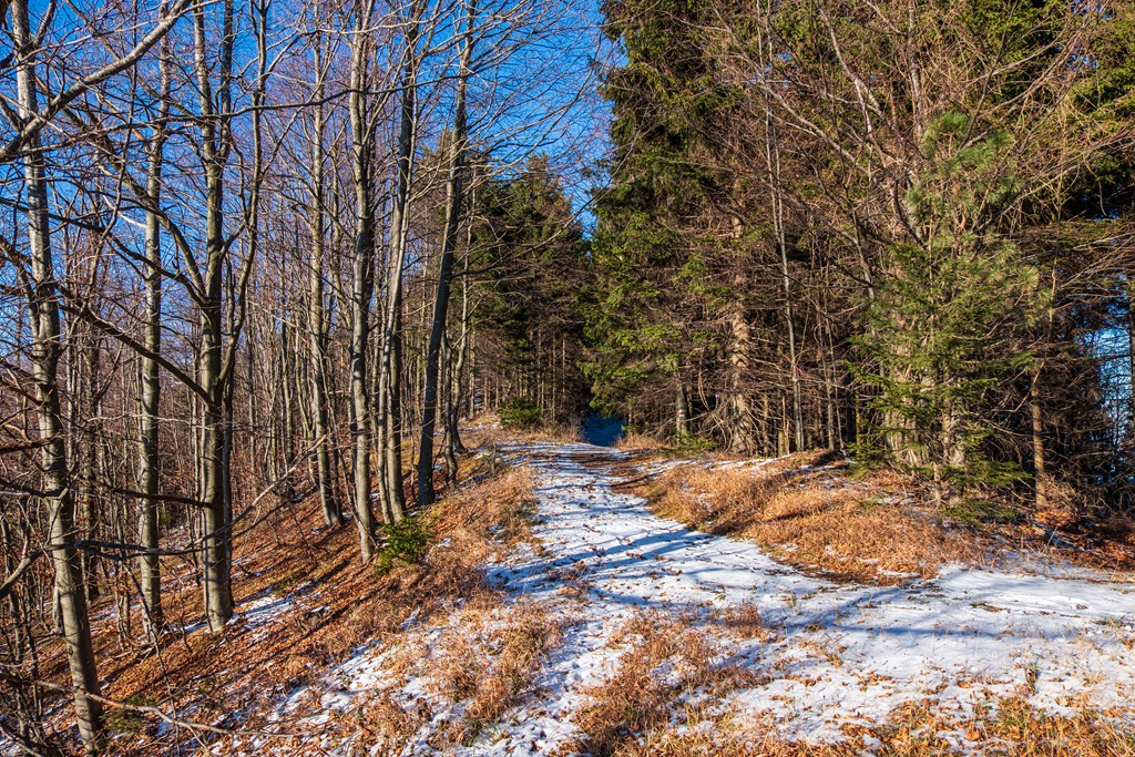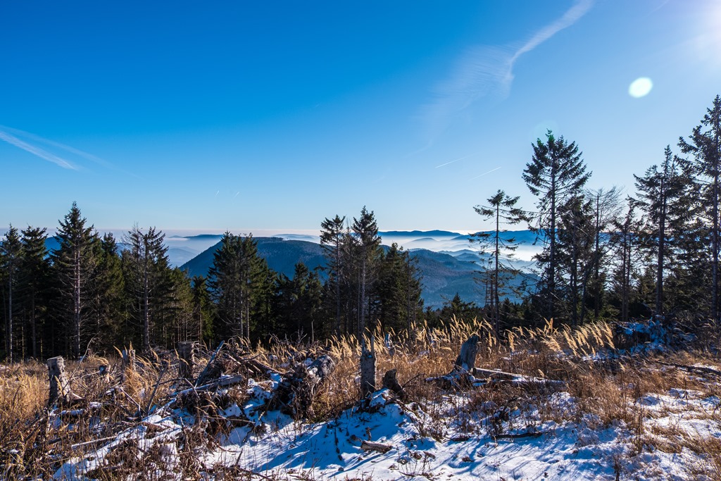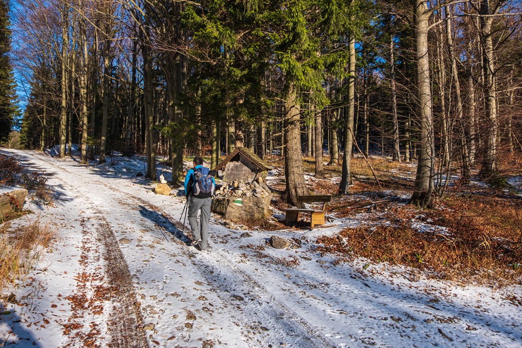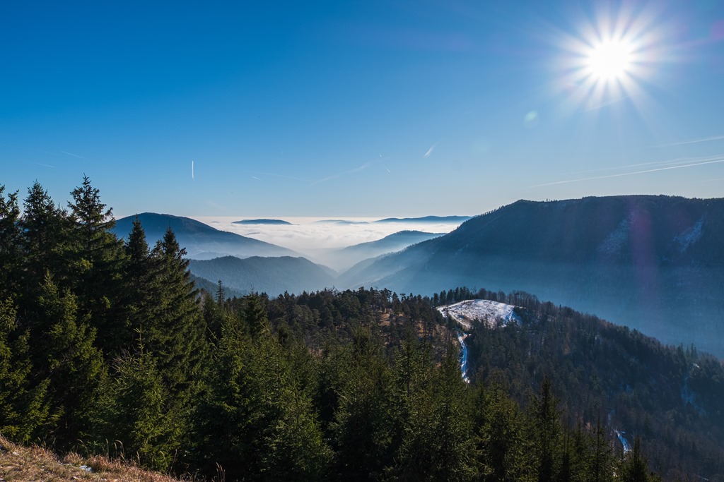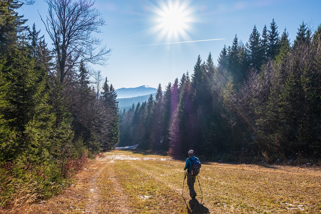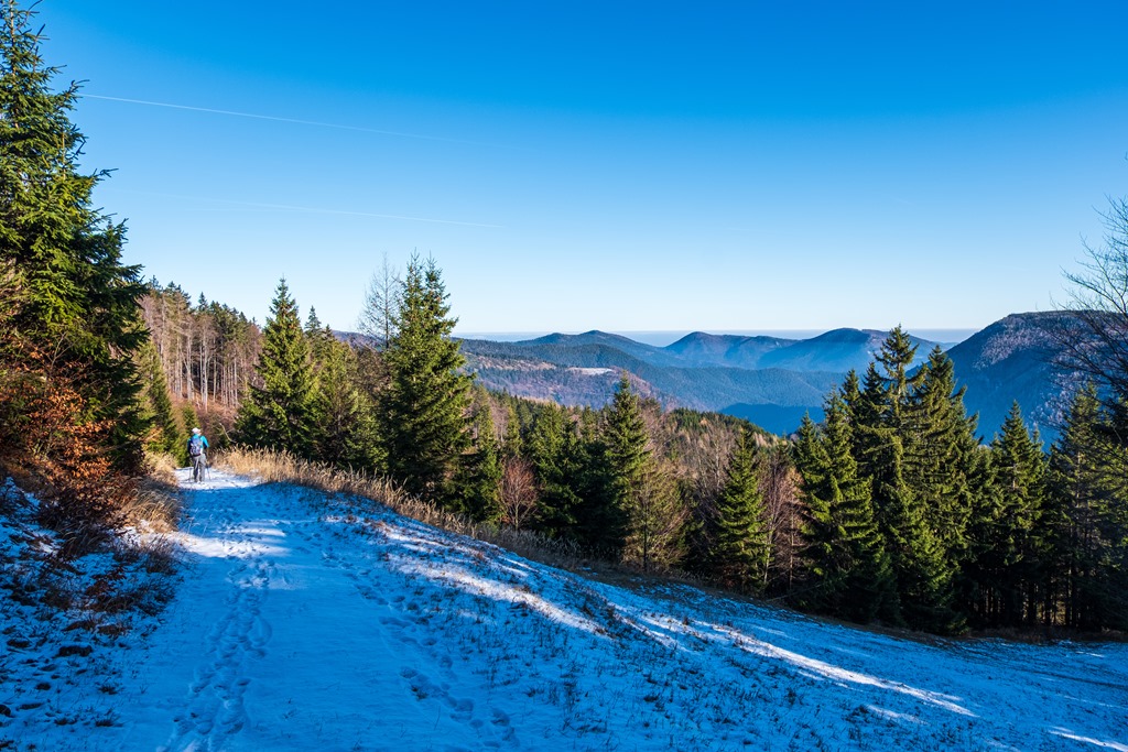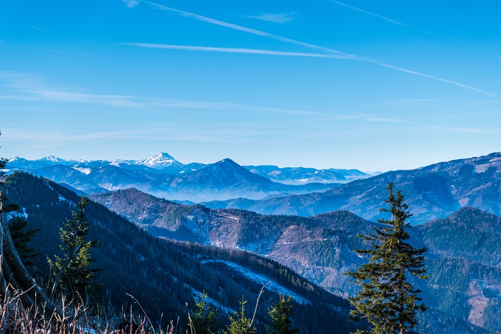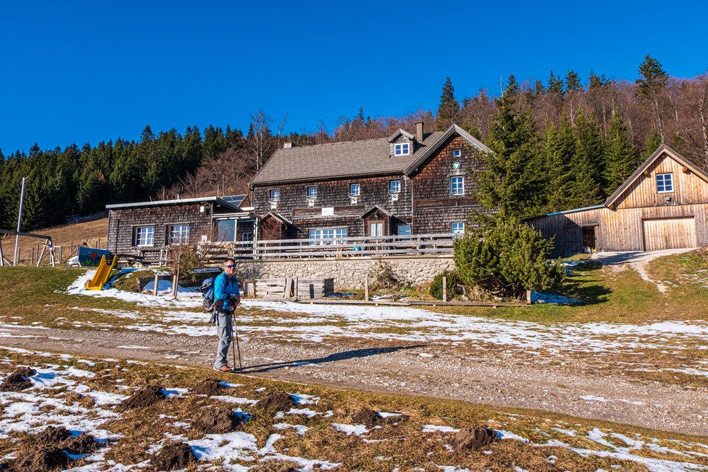 Tisztásokkal tarkított fenyveserdőn át kaptatunk. 11:00 órakor kilyukadunk a még kietlenül ásítozó síterepen. Élvezzük, ahogy akadálytalanul, langymelegen ragyog ránk a nap. A távolban tisztán rajzolódnak ki Alsó-Ausztria magasabb legmagasabb hegye, a Schneeberg.