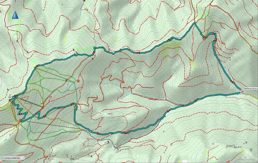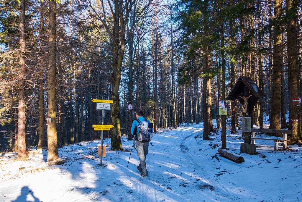 Még nincs 9:00 óra amikor felkerekedünk a kemény fagyban (-6 C fokot mutat a hőmérő, fenti kép). A nap a legszebb arcát mutatja és mivel inverzió van, reméljük, hogy feljebb majd melegszik az idő, és ez valóban beteljesül. Érkezünk a Bettelmannkreuzhoz (9:30, lenti képek), ahol egy derékszögű balraáttal ráfordulunk a Kirchwaldberg szelíd gerincére. Az útelágazás jobb szárnya a Kieneckre vinne.